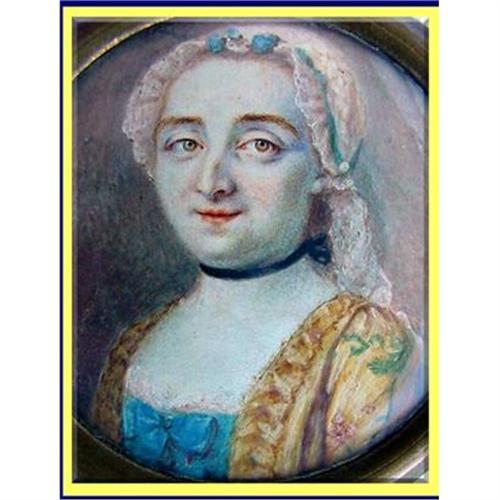 Beautifully painted with very fine detail to facial features. The lady wears an exquisite yellow silk embroidered jacket over a startling blue/turquoise dress with a bow in front. A simple black band around her neck and lace bonnet with train on her head. While not classically beautiful, the painter has managed to express a wonderful softness and intelligence that are even more intrigueing and befitting the relation of the famous French philosopher.
