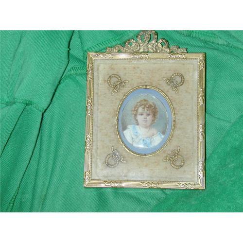 The miniature is in a guilt bronze frame dating from the 19th century. The miniature itself meaures 1.5 inches by 1.7 inches. The back is glazed to see the signature.