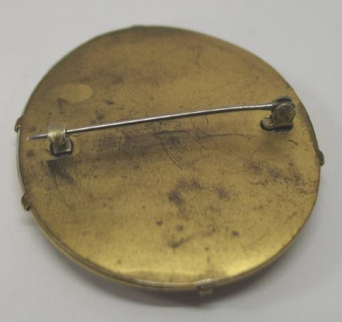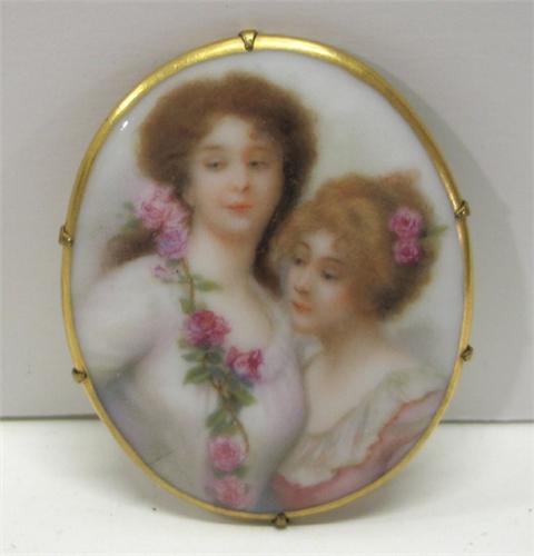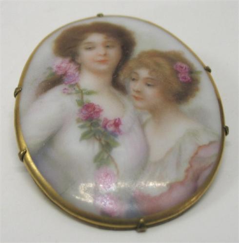 MINIATURE PORTRAIT ON PORCELAIN PIN. Depicts two young maidens. Has brass back and pin. 2” L
