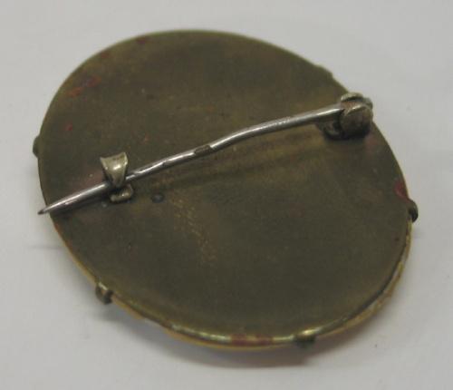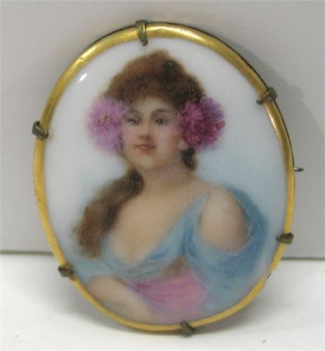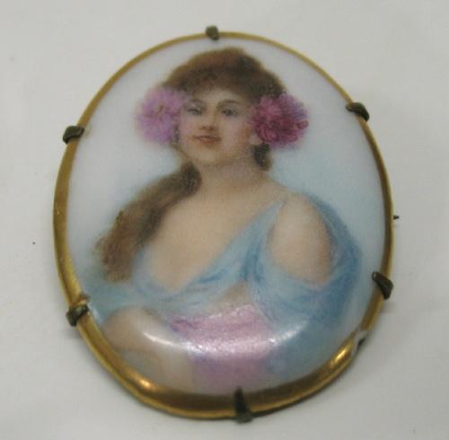 MINIATURE PORTRAIT ON PORCELAIN PIN. Depicts a young maiden. Has brass back and pin. 1.5” L