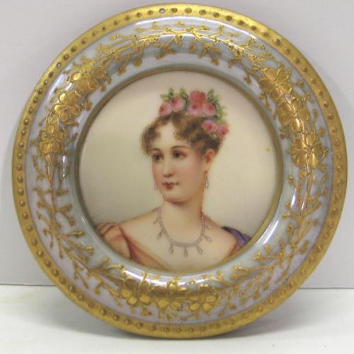 MINIATURE PORTRAIT ON PORCELAIN. In gilt jeweled decoration circular frame. Depicts a female. 3.75” Dia. framed.