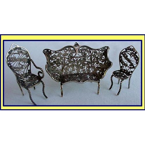 3piece set of miniature silver filigree furniture - not dollshouse furniture - possibly Russian or eastern European, late 19th century / early 20th century. Sofa / settee and man and woman chairs.<BR>The man's chair is a little under 1/2inches at the highest point and the sofa is 2 1/8inches wide accross the wings on the back. They are so tiny that their combined weight is 0.6oz.<BR>Exceptional silver filigree swirling patterns, made by a master craftsman / silversmith. <BR>There is no place for hallmarks, but we guarrantee that these are silver (in fact, they were quite tarnished when we got them). <BR>Condition is excellent. No missing/broken bits.