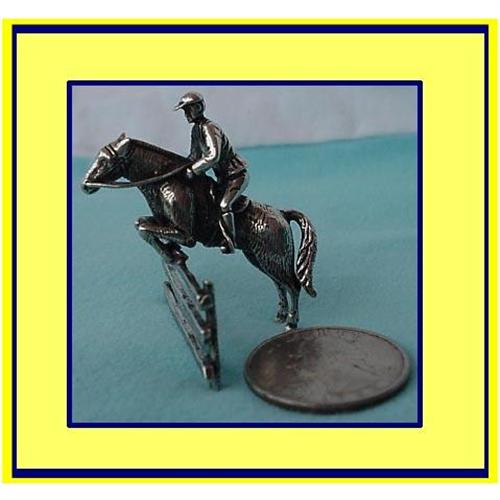 <tr><td>Title:MINIATURE SILVER JOCKEY on HORSE JUMPING FENCE</td></tr>