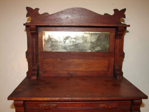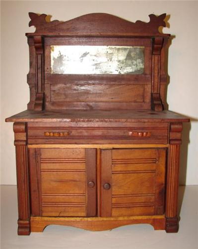 MINIATURE DOLL SOFTWOOD SERVER WITH MIRRORED BACK. Mirror with shelf at top over single drawer over two blind doors at bottom. 18.5" H, 13.5" W, 8" D