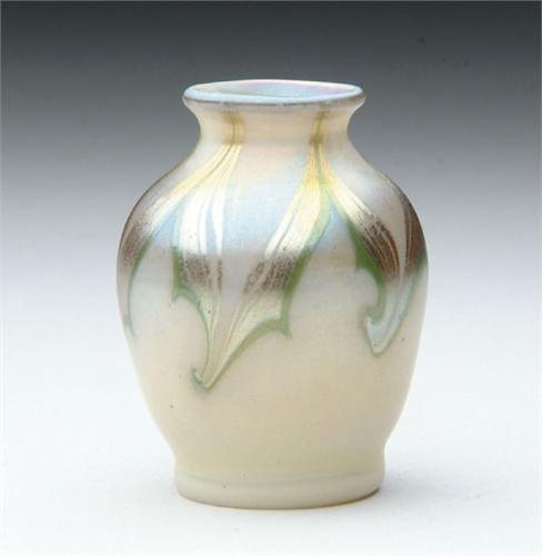 MINIATURE TIFFANY VASE. Wonderful miniature vase has gold hooked feather decoration with green outline against a slightly iridescent cream colored background. Signed on the underside "LCT 5208E". SIZE: 2-1/4 in. t. CONDITION: Very good to excellent. 5-61282