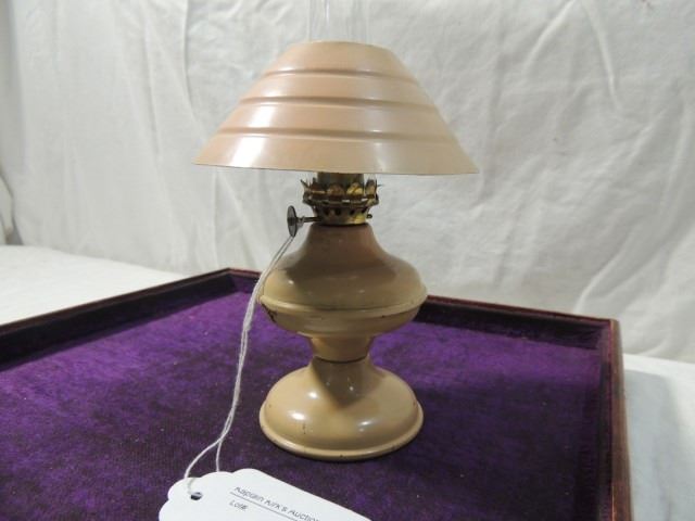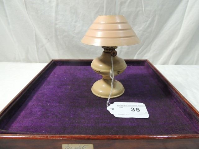 P & A ACORN MASRKED BURNER, SMALL LAMP, STANDS JUST 7.5" TALL, COMPLETE WITH CHIMNEY, AND METAL TOPPER, AS SHOWN.