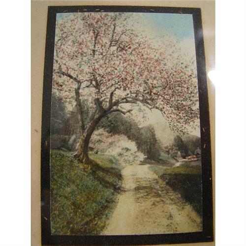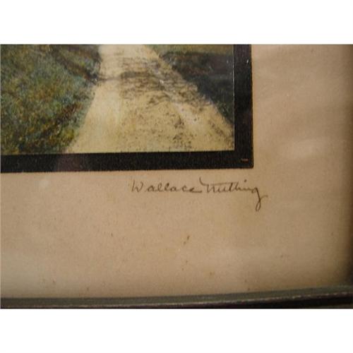 MINIATURE WALLACE NUTTING PRINT. Depicts an exterior scene with a dogwood tree along a dirt road. Signed “Wallace Nutting”. 3” x 2”. Frame: 5.5” x 4.5”.