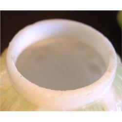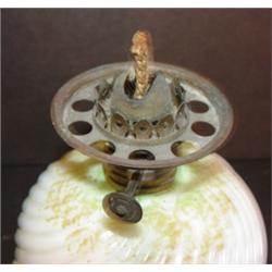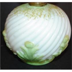 MINIATURE WHITE GLASS OIL LAMP. Relief decorated and green painted floral decoration on base & shade. Burner knob turns freely. Minimal roughness to top and bottom edge of shade. 8.25" H