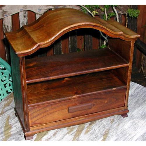 MINIATURE WOOD CABINET WITH DRAWER<p>A charming miniature hutch or display cabinet in a rich honey-brown or teak-colored patina, with a single drawer and two shelves for display. This attractive piece can be hung on a wall or used on a table. Age appears to be about mid-20th century, origin American, and condition is excellent. Photos show front, side and back views.