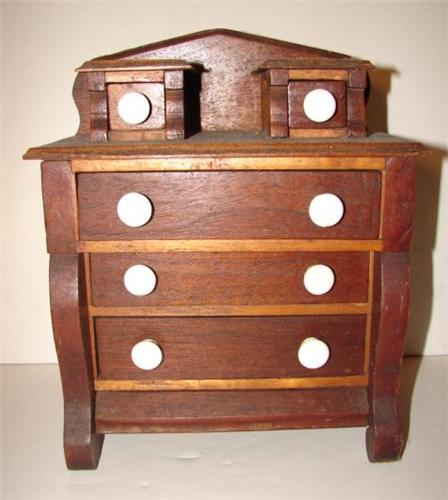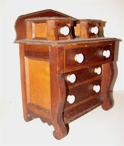 MINIATURE WOODEN DRESSER. Has two handkerchief drawers at top over three drawers. Dresser is made from oak, walnut, & softwood. Has porcelain knobs at drawer fronts. Underside of top drawer is marked “Bessie Patters/Carleton/To John”. Shows a small amount of loss to wood at top left. 11.75” H, 9.75” W, 5.75” D