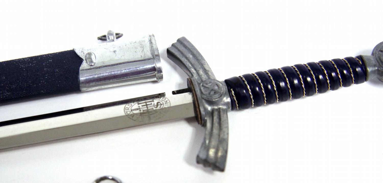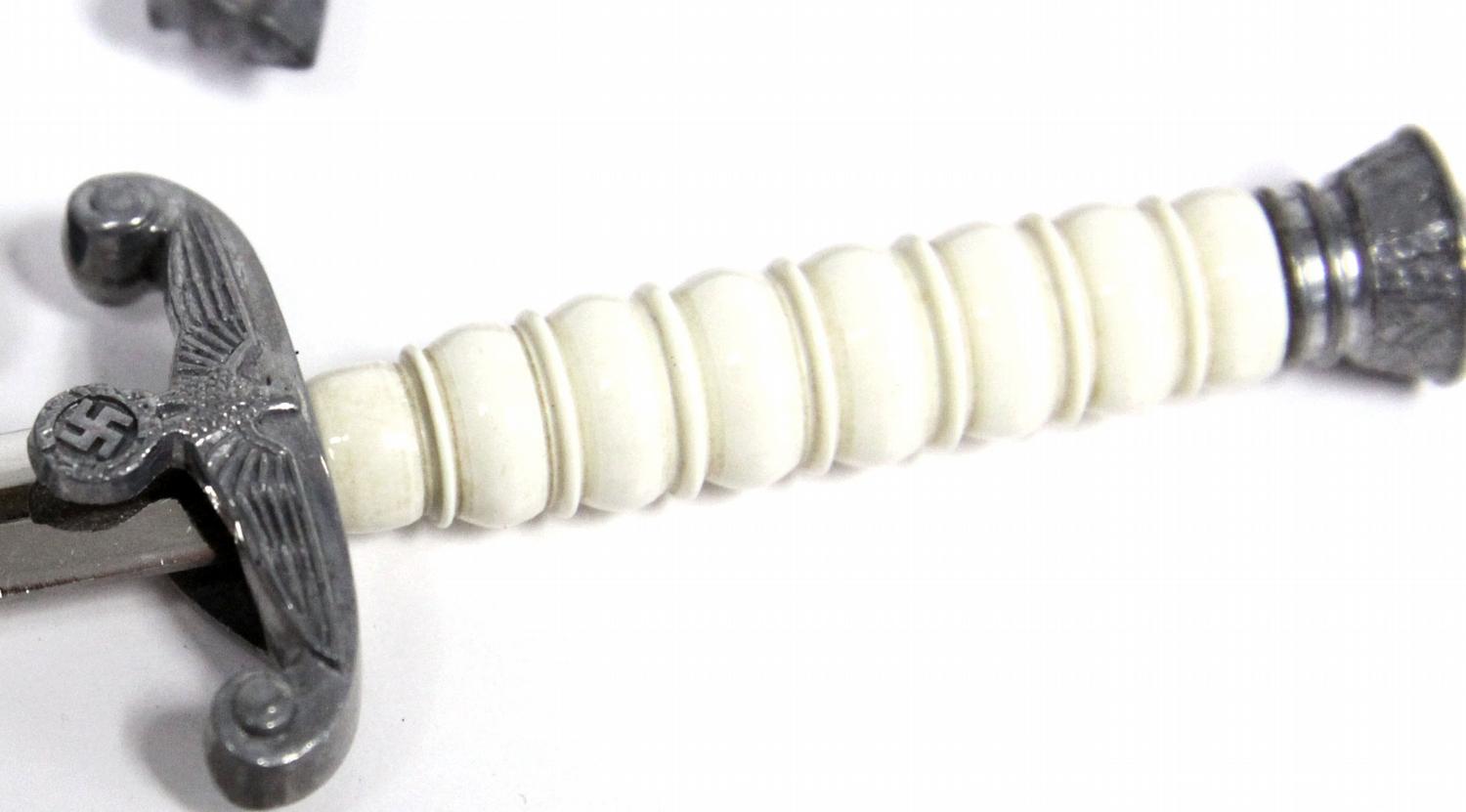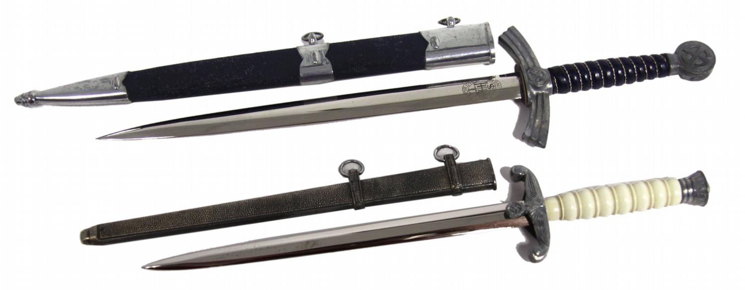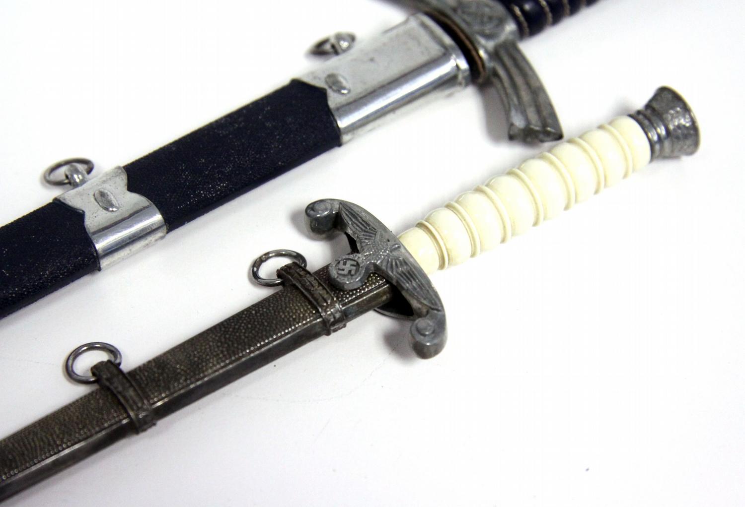 9.5 inch miniature German Luftwaffe dagger by E & F Horster with navy blue handle and sheath. 7.5 inch unmarked miniature German army dagger with good details.