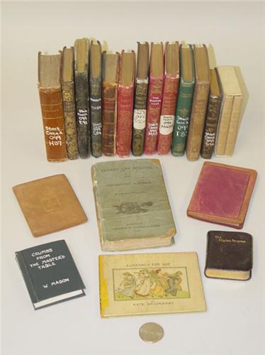 MINIATURES - Some Local Imprints. A Group of 20 Volumes as Listed. Hard Cover. Ex-Library. Good condition. 2 - 64mo, 6 - 48mo, 10 - 32mo & 2 - 24mo. as follows: **Pilgrims Progress by John Bunyan (1896) London: Henry Frowde. 2 parts in 1 bound in leather. **Crumbs From the Masters Table by W. Mason (1937) NY: D. Appleton-Century Co. In library binding. **Guide to Domestic Happiness in a Series of Letters (n.d. circa 1833) NY: C. Wells. In blind stamped cloth with gilt design, aeg. **Gold Dust - 2 volumes in Slipcase (n.d. circa 1880) NY: E. & J.B. Young & Co.. In gilt decorated cloth. **Langham Booklet - Moments With Plato complied by G. Villiers (nd) Siegle, Hill & Co. In suede, front hinge cracked. **Norka Series - The Recessional and Other Poems by Rudyard Kipling (nd) Akron: Saalfield Publishing Co. In suede, gilt rubbed. **Almanack For 1887 by Kate Greenaway (1887) 1st Edition. George Routledge & Sons. Color illustrations throughout in illustrated covers. Spine cloth taped. **Lalla Rookh: An Oriental Romance by Thomas Moore (a new edition) NY: D. Appleton & Co. AEG, frontis w/tissue guard bound in blind stamped cloth, gilt decorated spine. **The Poetical Works of Mrs. Hemans 2 Volumes in 1 (1839) Philadelphia: Henry F. Anners. Bound in leather, frontis loose, occ foxing. **The Lady's Token: or Gift of Friendship edited by Cotesworth Pinckney (1848) 1st Edition, Nashua NH: J. Buffum. AEG, color frontis w/tissue guard, bound in blind stamped cloth w/gilt decorations. **The Flower Vase; Containing the Language of Flowers and Their Poetic Sentiments by Miss S.C. Edgarton (1844) Lowell: Powers & Bagley. AEG, chromo frontis w/tissue guard, bound in blind stamped cloth w/gilt decorations. **The Floral Fortune-Teller; A Game For the Season of Flowers by Miss S.C. Edgarton (1847) Boston: A. Tompkins. AEG, color frontis w/tissue guard, bound in blind stamped cloth with gilt decoration/illustration, foxing. **Geraldine by Martin Farquhar Tupper (nd) Buffalo: Breed & Lent. AEG, in blind stamped cloth, gilt on spine. **The Oracles of Shakspeare: With a Selection of Aphorisms by Robert Hamilton (1852) Auburn: Alden, Beardsley & Co. AEG, in blind stamped cloth, gilt on spine, wear to top of backstrip. **The Hare-Bell; a Token of Friendship edited by Rev. C.W. Everest (1845) 3rd edition, Hartford: Henry S. Parsons. AEG, frontis, in blind stamped cloth, gilt illustration, gilt decorated spine, front hinge cracked. **The Laws of Nature, or Principles of Morality, Deduced from the Physical Condition of Mankind and the Universe by C.F. Volney (1807) Pittsfield: Seymour & White. iv, 162pp, some pp absent from the advertisement section. Bound in leather, red leather spine label, cracked gutters. **Friendship's Token; and the Lover's Gift edited by Lewis Gaylord Clark (1854) 3rd Edition, New Orleans: Burnett & Bostwick. AEG, color frontis bound in blind stamped cloth with gilt illustration, gilt decorated spine, occ foxing. **Evening Recreations; A Collection of Original Stories, Written by a Lady for the Amusement of Her Young Friends (1809) Kenne NH: John Prentiss. Lacks ffp's, bound in 1/2 leather & paper over boards, foxing, covers worn. **Alonzo and Melissa, or the Unfeeling Father, a Tale Founded on Fact by Daniel Jackson (1836) Boston: Charles Gaylord. Bound in paper over wooden boards, cover wear, foxing, portions of backstrip absent.