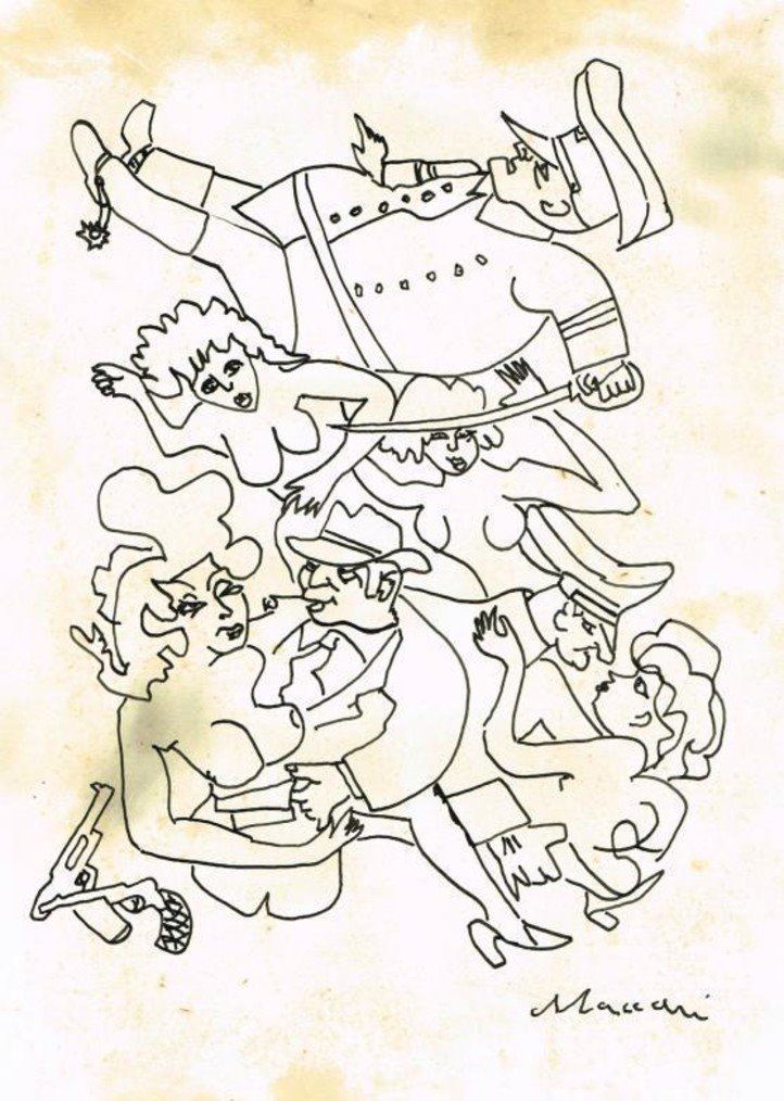 A drawing of men seducing women by Mino Maccari. It measures 12x7.75 inches. It has been professionally mounted and framed and comes supplied with coa.