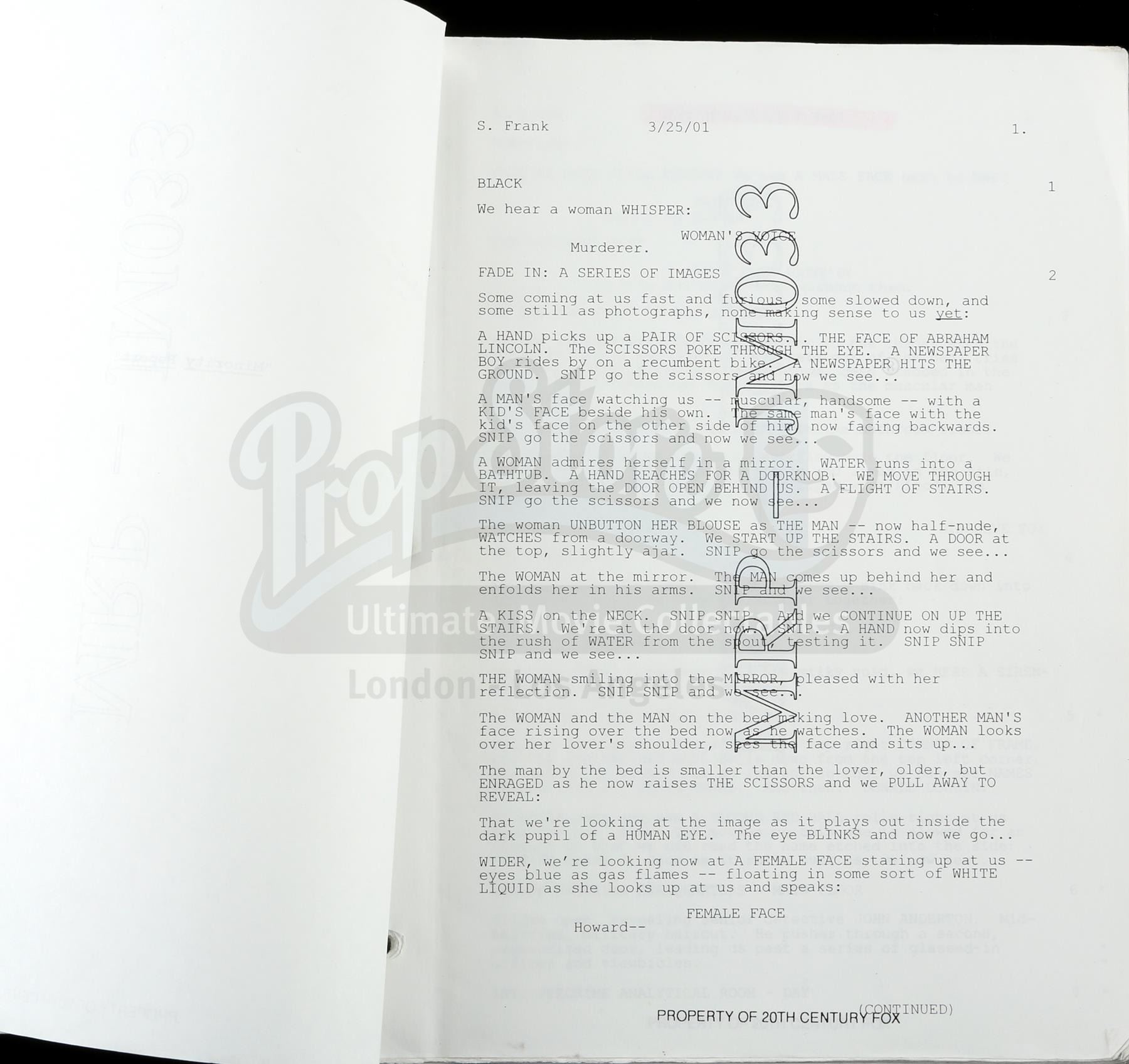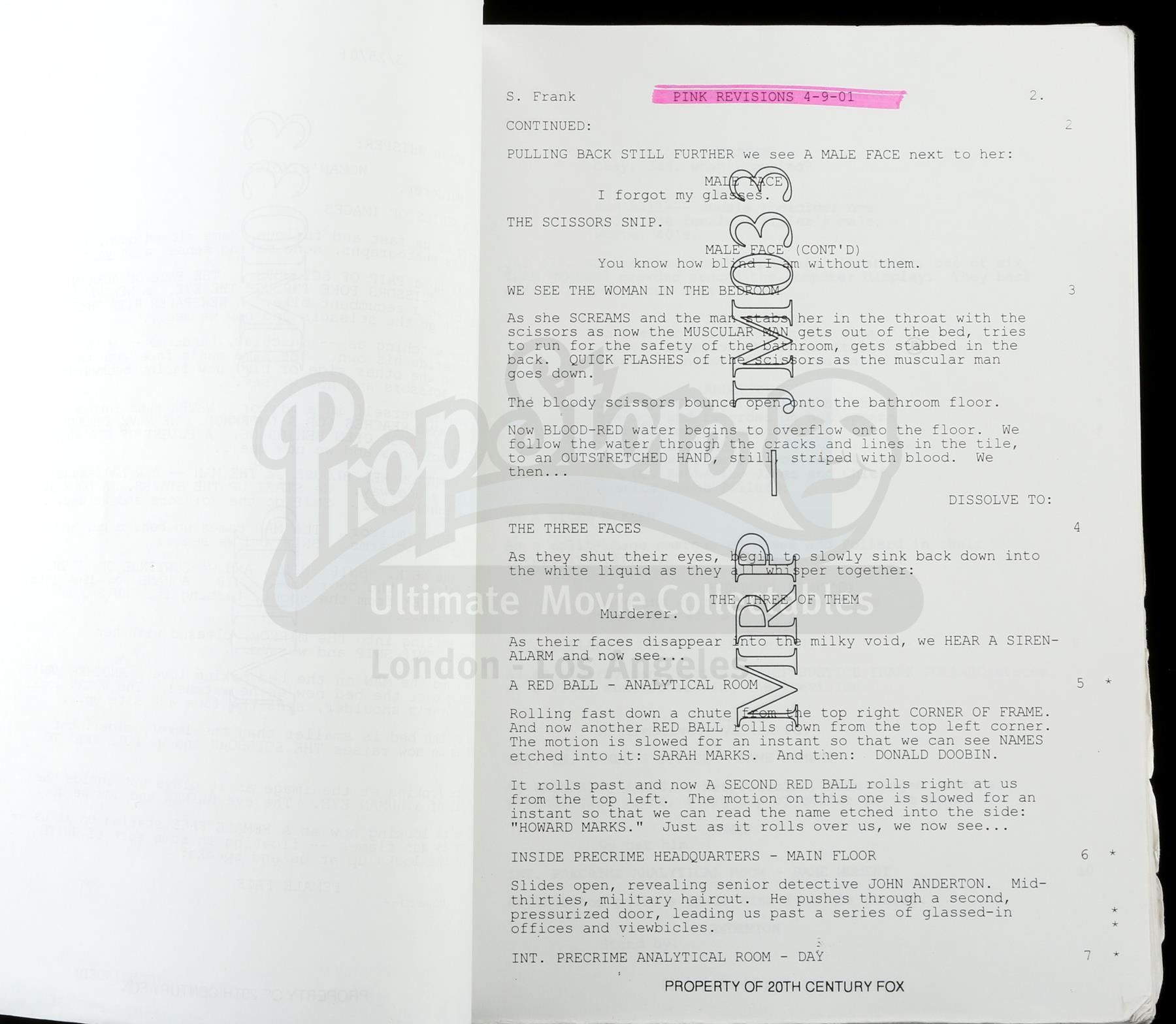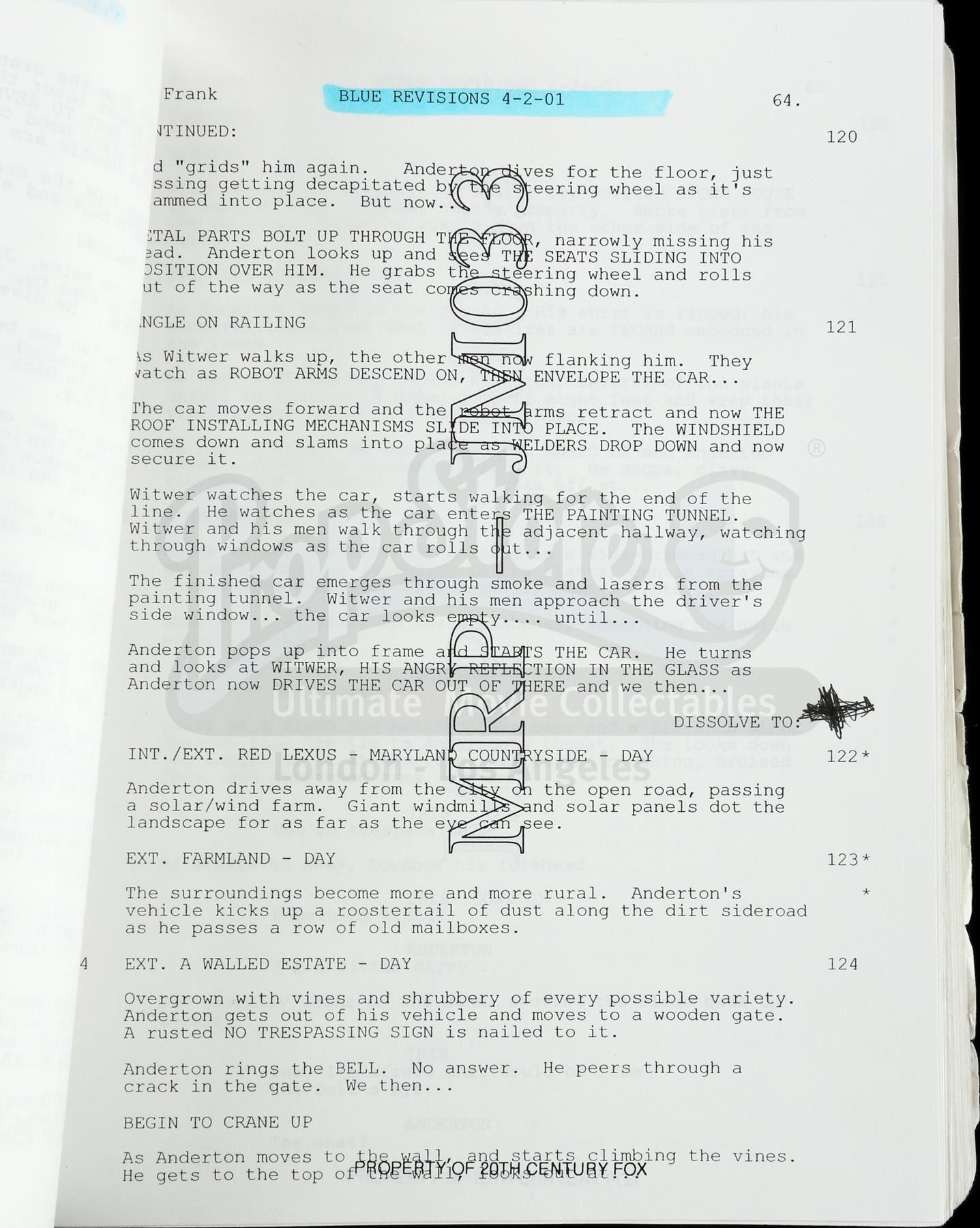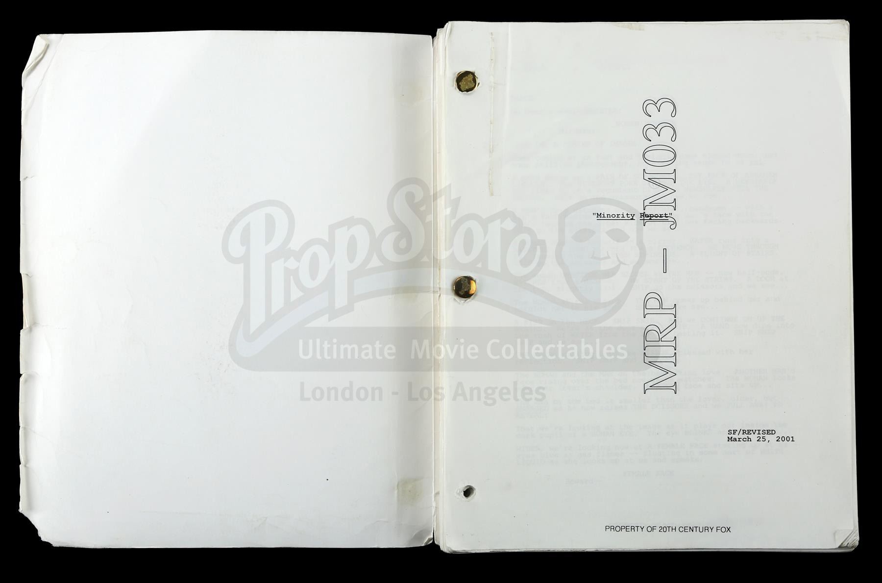 A shooting script from the production of Steven Spielberg's sci-fi thriller Minority Report. The film, based on a Philip K. Dick short story, centres on Police Chief John Anderton (Tom Cruise), who was framed for murder in a future when crimes can be stopped before they take place.