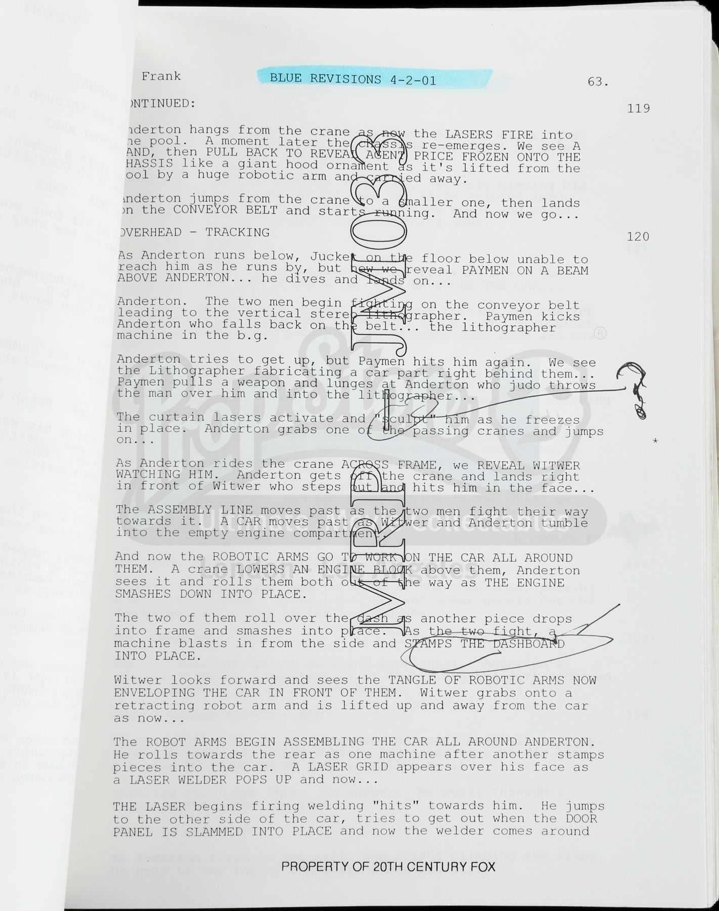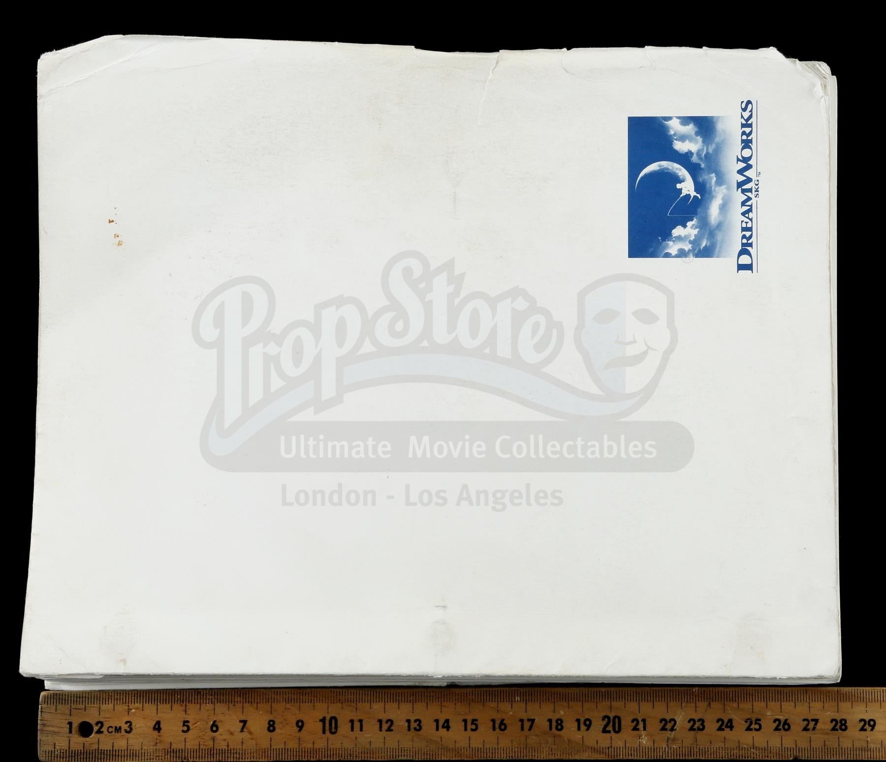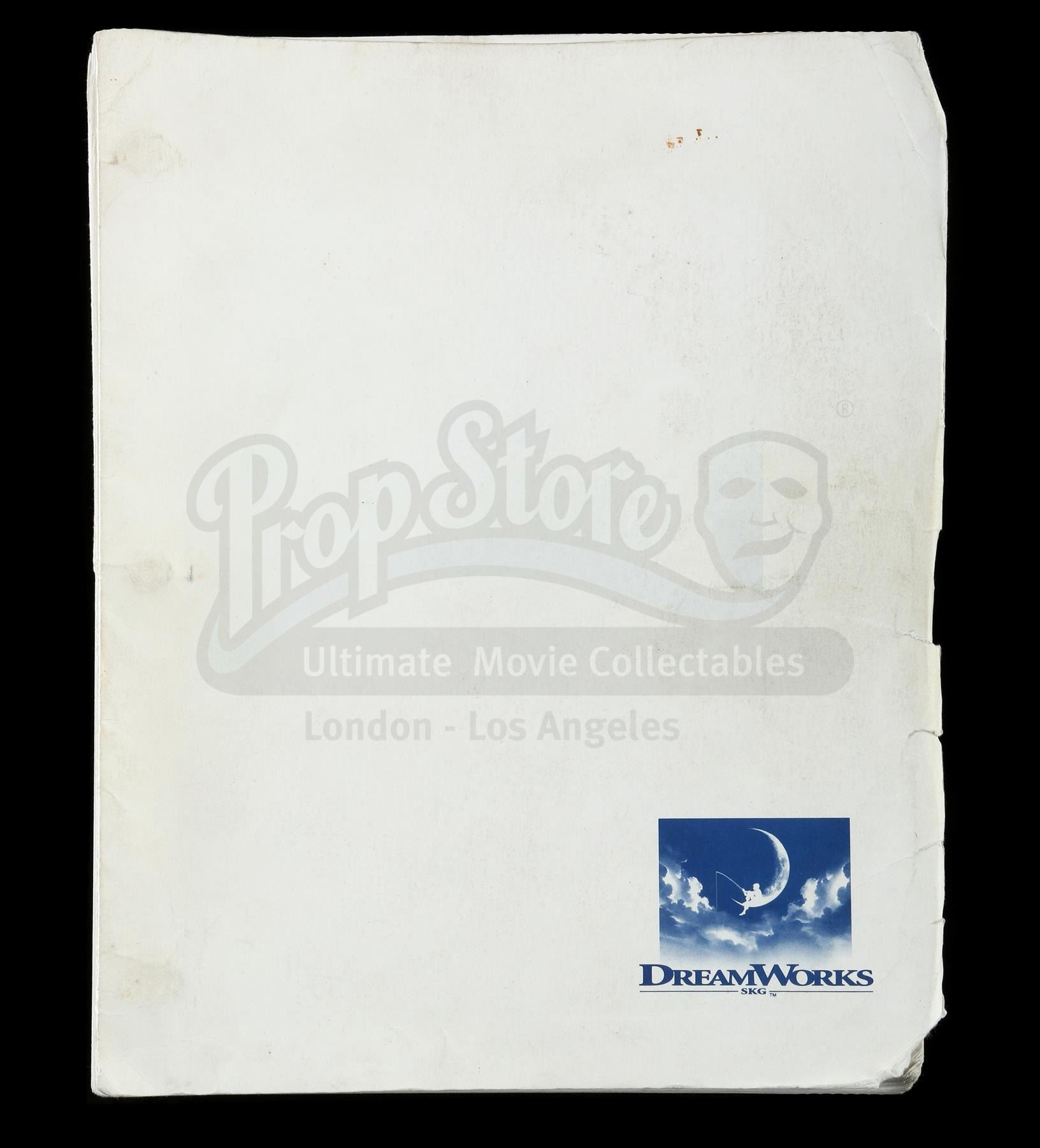 This 153-page script comes with a paper DreamWorks SKG cover and is secured with two brass brads. It is labelled "SF/Revised March 25, 2001" on page 1. Many of its pages are highlighted by production, and the script exhibits visible wear from handling and age. It is presented loose. Dimensions: 29.25 cm x 23 cm x 5 cm (11 1/2" x 9" x 2")