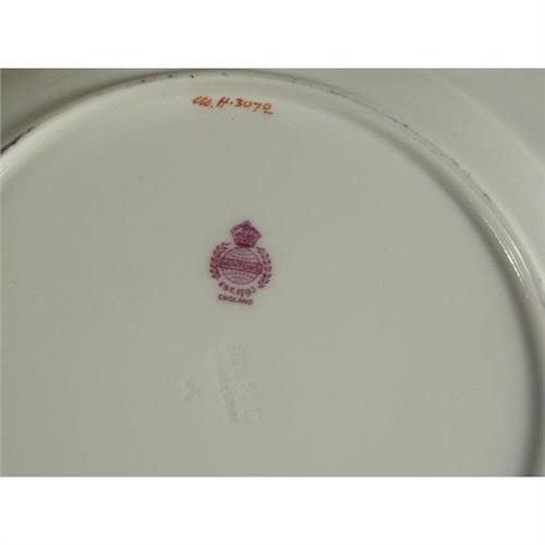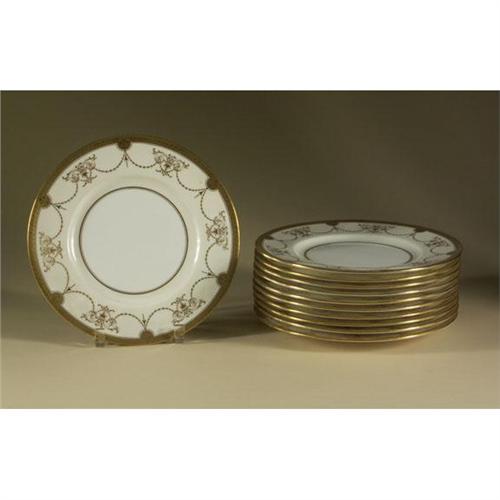 PORCELAIN: A twelve piece setting of Minton China base or dinner plates, H3707, hallmarked, 1912-1954, 10.25'', having classic half inch gold inscribed trim with applied swags and an elaborate scroll and floral display, 1920-1930. Note: Minor surface wear commensurate with age, no chips or repairs noted.