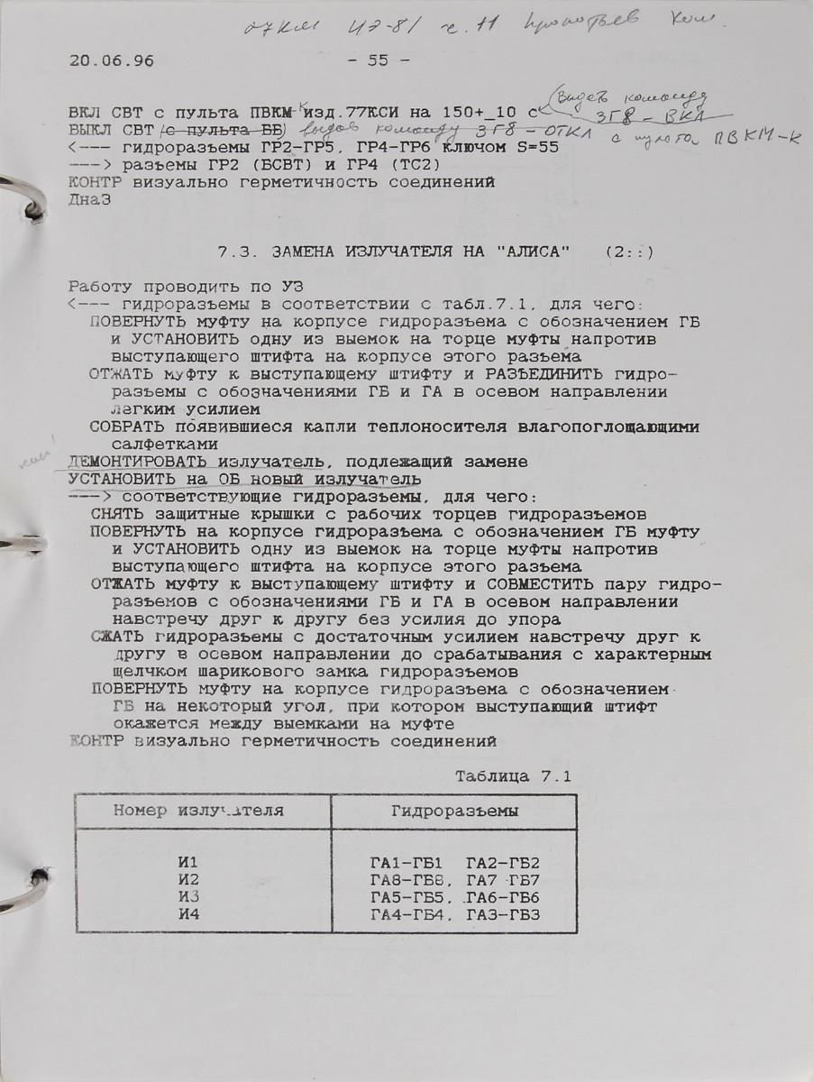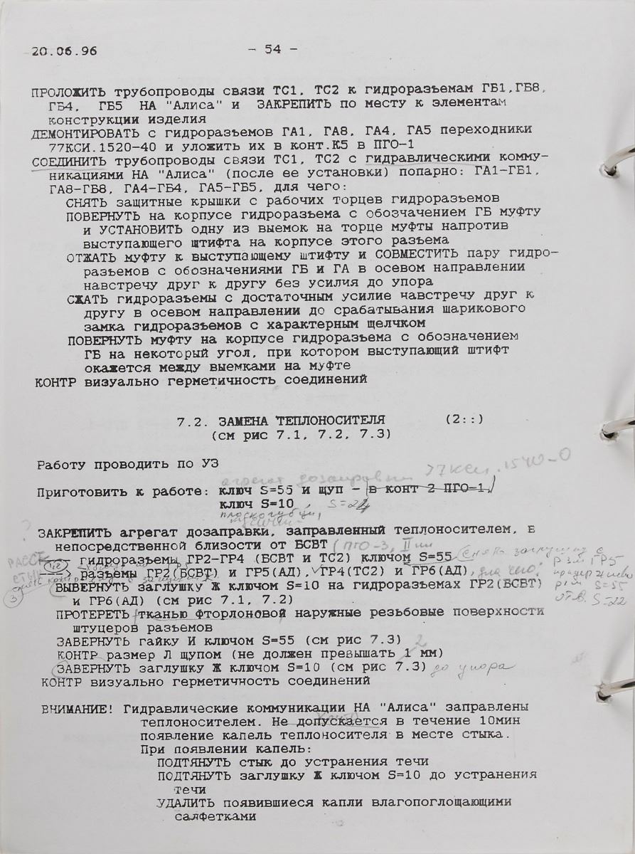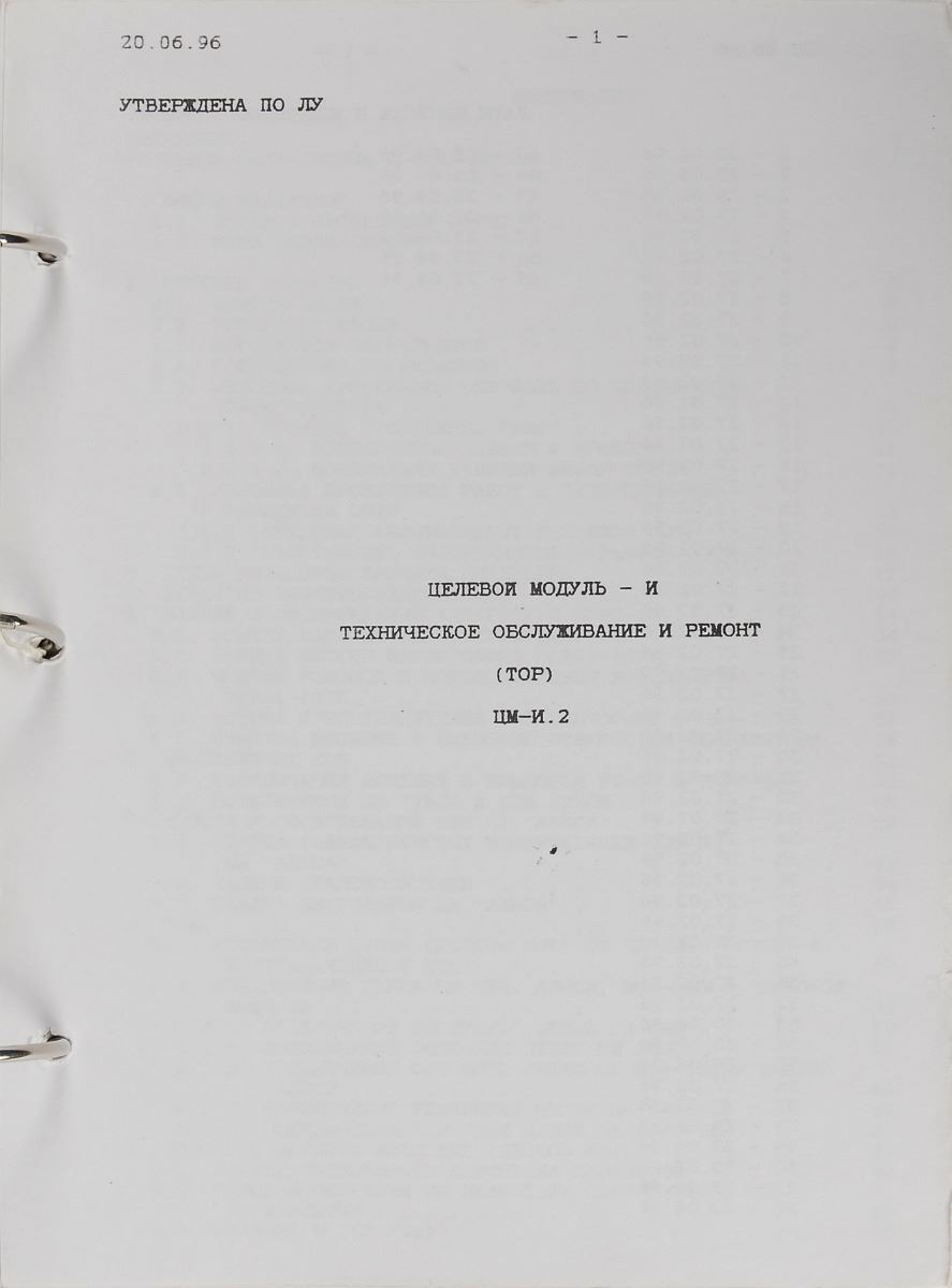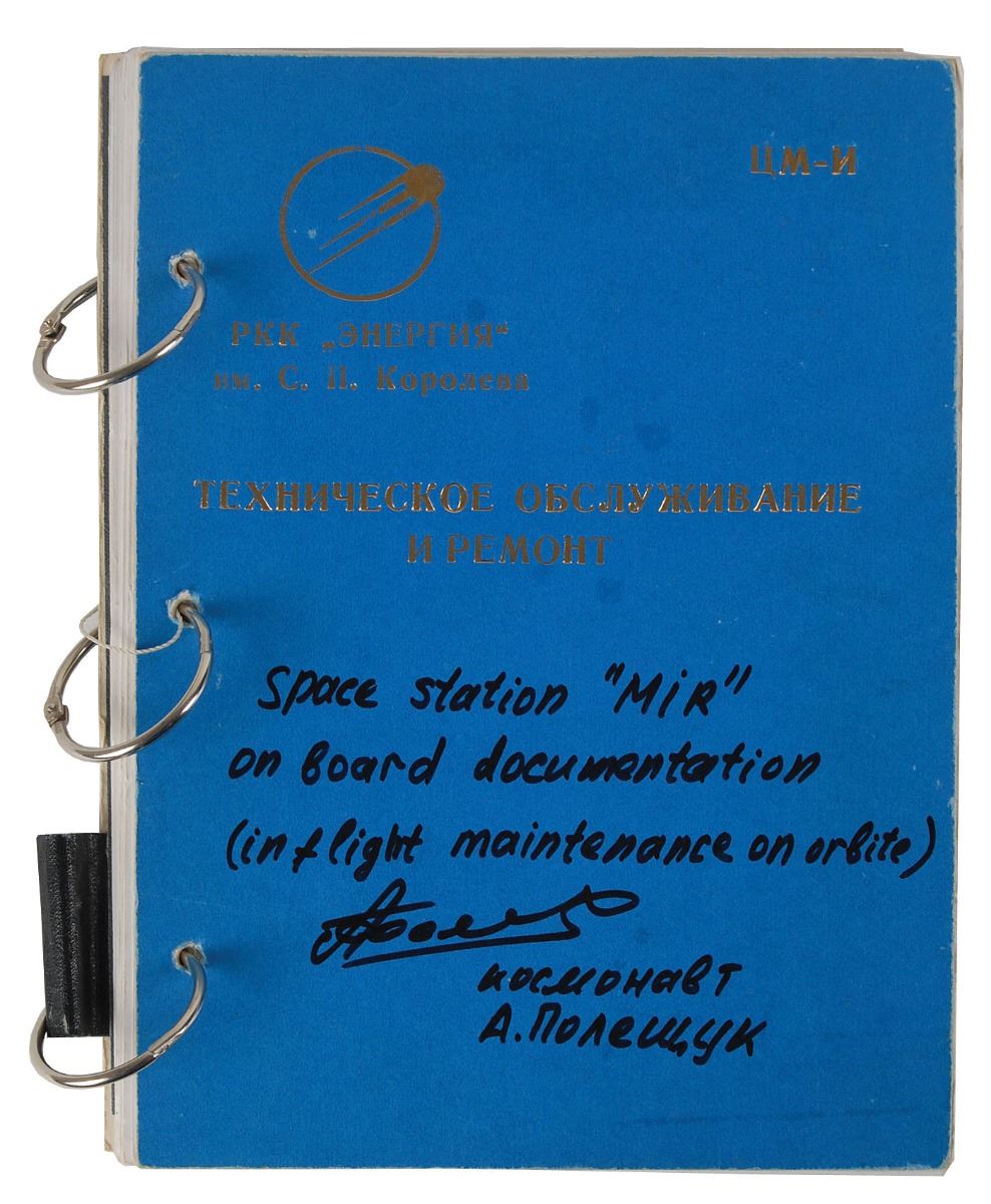 Rare ring-bound MIR onboard maintenance training checklist in Cyrillic, 7.75 x 10.25, 70 pages, dated June 20, 1996, consisting of detailed instructions and diagrams with copious handwritten cosmonaut notes. Signed and flight-certified on the front cover in black felt tip by cosmonaut Alexander Poleshchuk, “Space station ‘MIR’ on board documentation, (inflight maintenance on orbite).” In fine condition. Poleshchuk was the flight engineer for the Soyuz TM-16 mission, the sixteenth expedition to the Russian Space Station Mir.