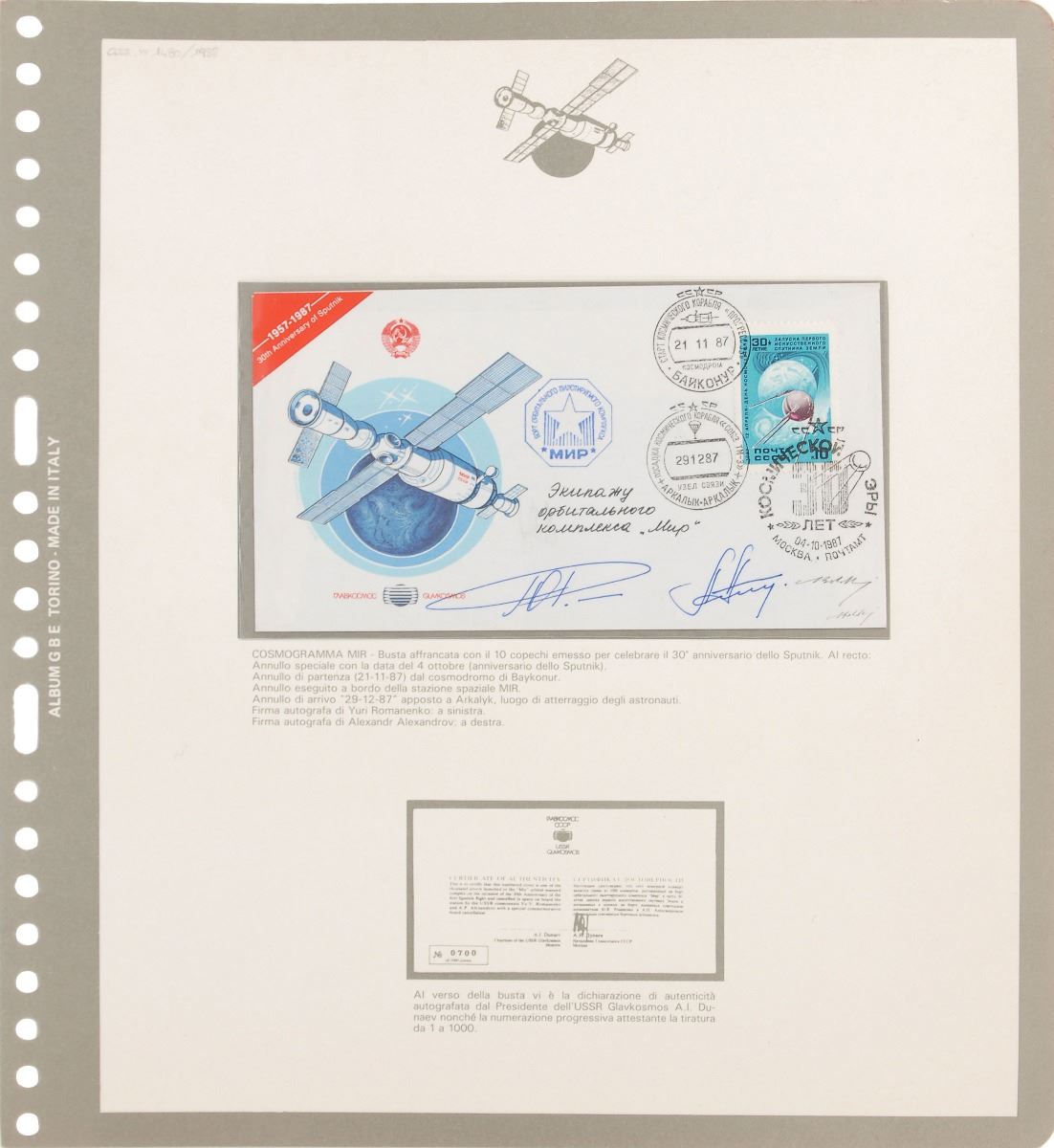 Uncommon 30th anniversary Sputnik commemorative cover with a large cachet of the famous MIR space station, postmarked November 11, 1987, and December 29, 1987, signed in blue ink by Yury Romanenko and Aleksandr Aleksandrov. In fine condition. Also accompanied by a folder and certificate of authenticity from Qualita Bolaffi.