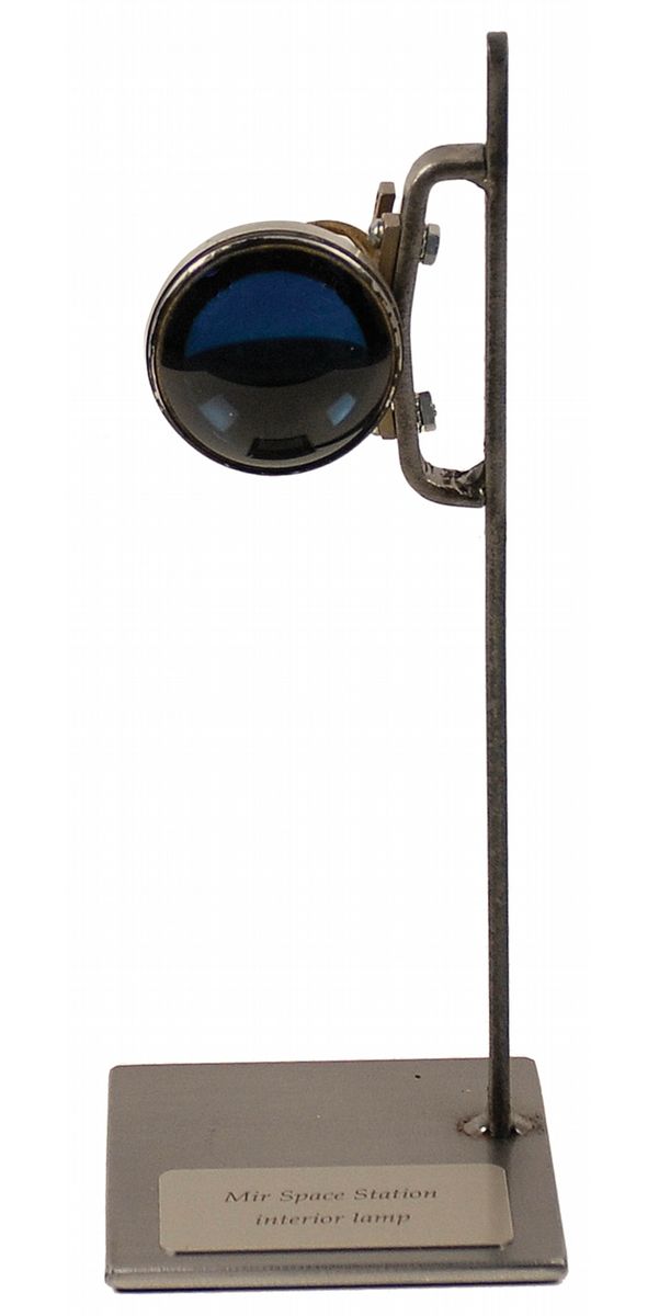 Mir space station interior blue lamp. Bulb’s diameter measures approximately 2? and is complete with housing and wiring. Lamp is affixed to a vertical display stand measuring 10? high with a descriptive flag on the base. In fine condition.