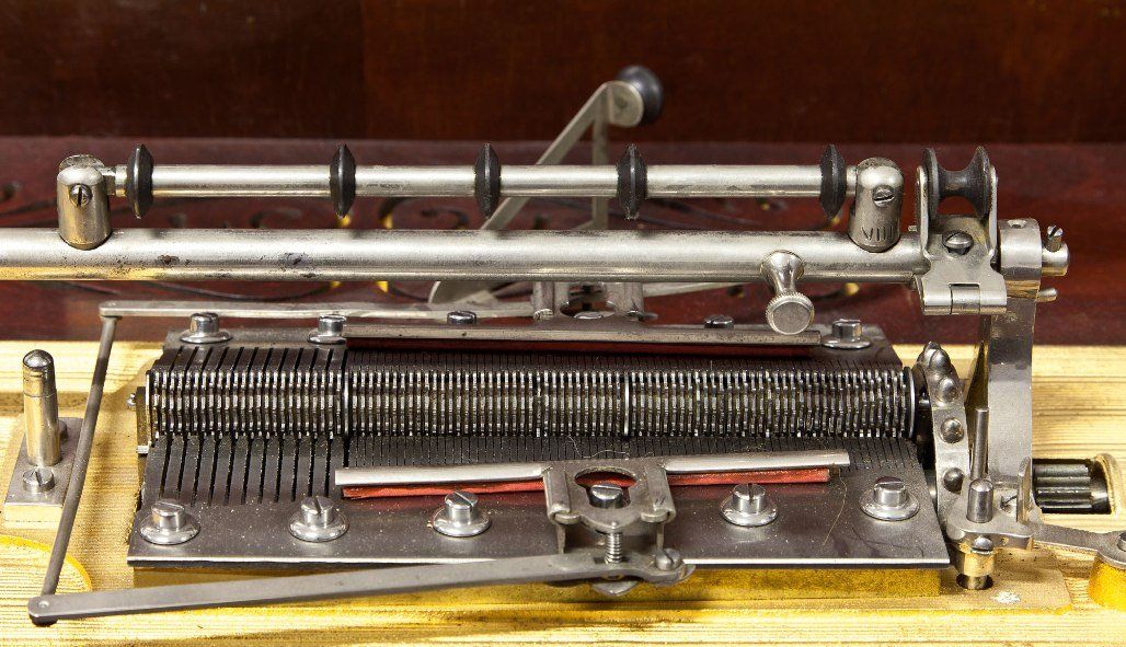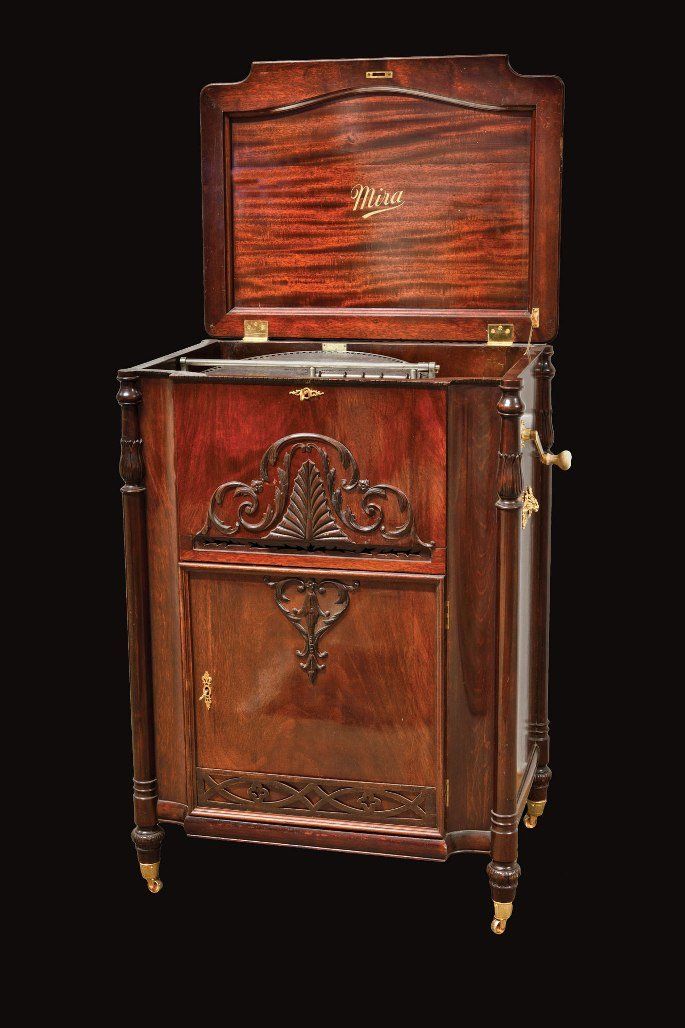 MIRA Plattenspieldose. Fantastische Mira Plattenspieldose im Mahagoni Prunkgehäuse. Sehr selten. Mit 22 Platten. Museumsqualität. 73 x 59 x 105cm. Mermod Freres, St. Croix, Switzerland, circa 1904.