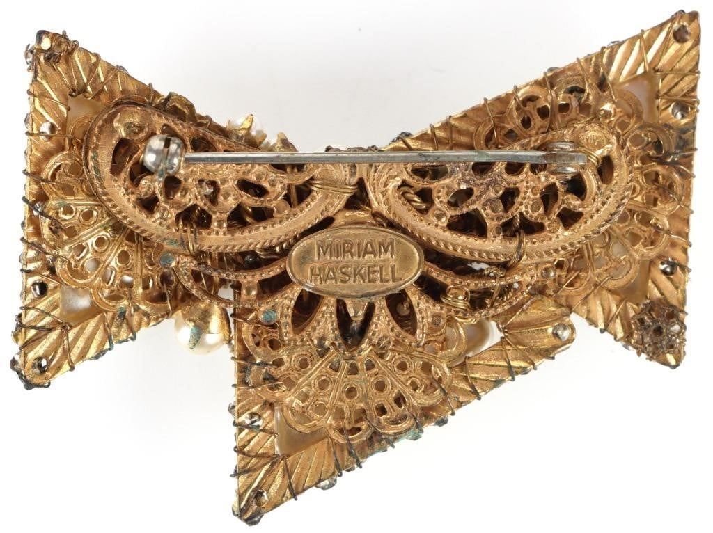 Miriam Haskell pearl finish & rhinestone jewelry (3) to include: a brooch, set of clip on earrings, pendant.