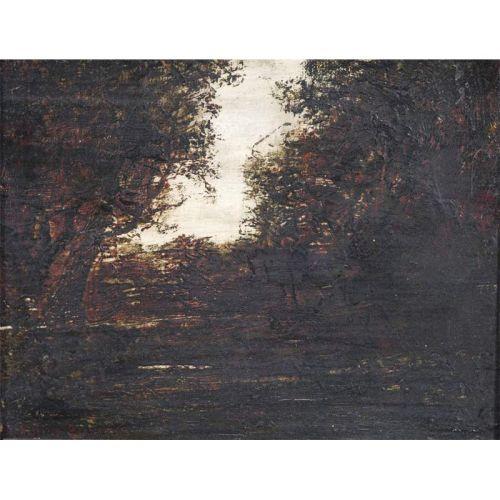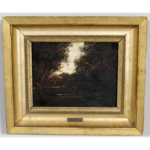 MIRIAN BLAKELOCK Opening in a Dark Landscape 8 1/4"x 10 1/4" oil on canvas, signed lower left, plaque attached to frame reads "to Mary Kirkland Hall from Mrs. J.H. Kirkland" CONDITION REPORT: scattered minor inpainting. PACKING AND SHIPPING: We offer packing (double boxed in most cases) and shipping of this item within the Continental United States by USPS or UPS (our choice- boxes over 30lbs or oversized may be recalculated based on buyer's location), NOT INCLUDING INSURANCE (it will be added when we know the sales price) for $40