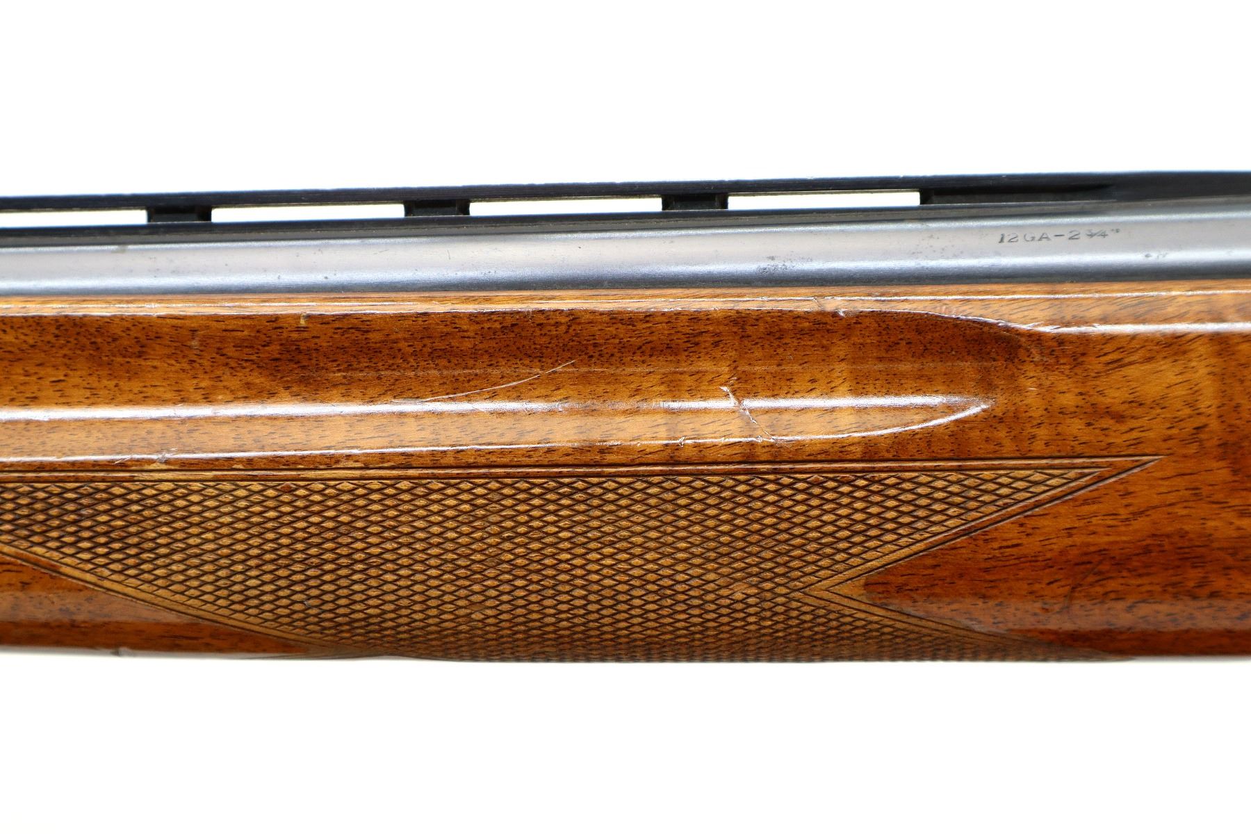 Main Description: Brass bead, blued finish, vent rib, engraved receiver, automatic selective safety, ejectors, single gold inertia trigger. Two piece wood stocks, finger grooved checkered forearm and pistol grip cracked behind trigger guard on both sides, BC Miroku logo black polymer butt plate, sling swivels, front swivel has the screw replaced with a pin.