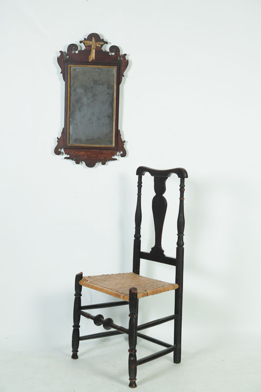 American, 2nd half-19th century. Side chair attributed to Southern Connecticut. Turned with vase splat. 16"h. seat, 39"h. overall. And a transitional Chippendale to Hepplewhite mirror. Inlaid frame with carved crests. 29"h. 12"w. Imperfections.