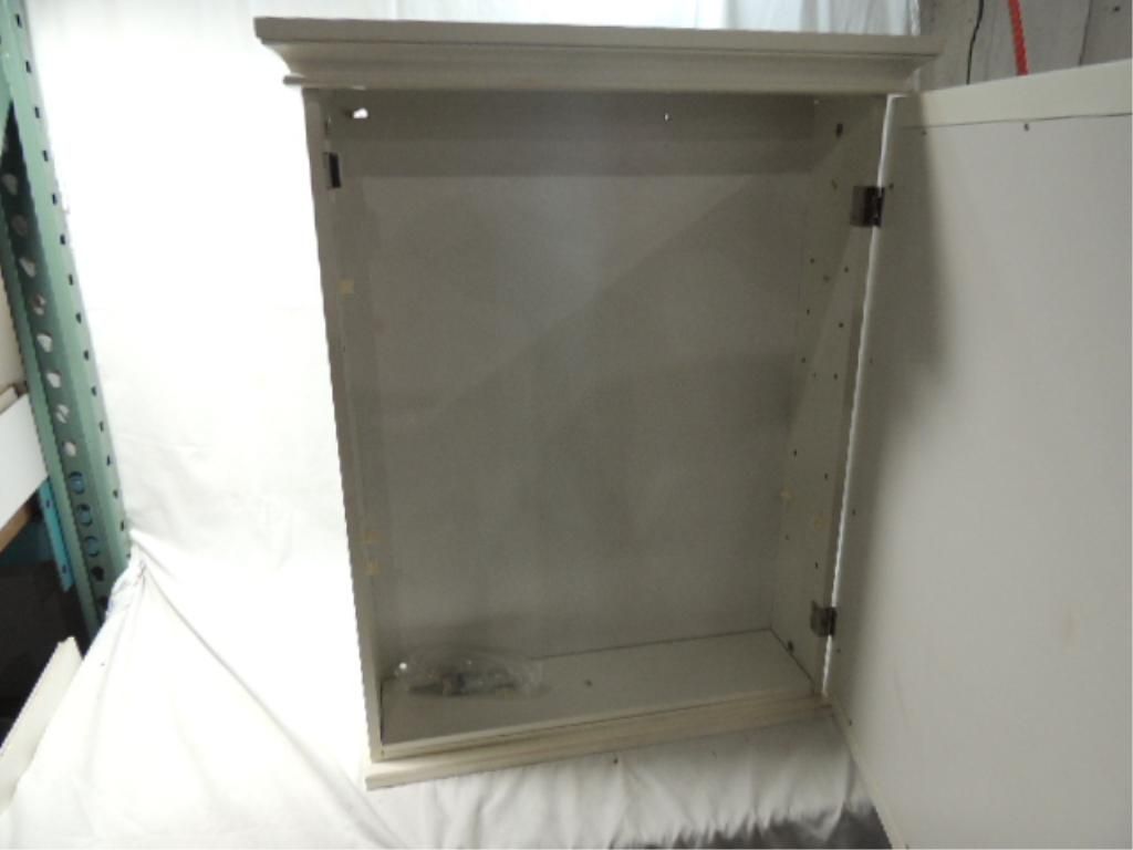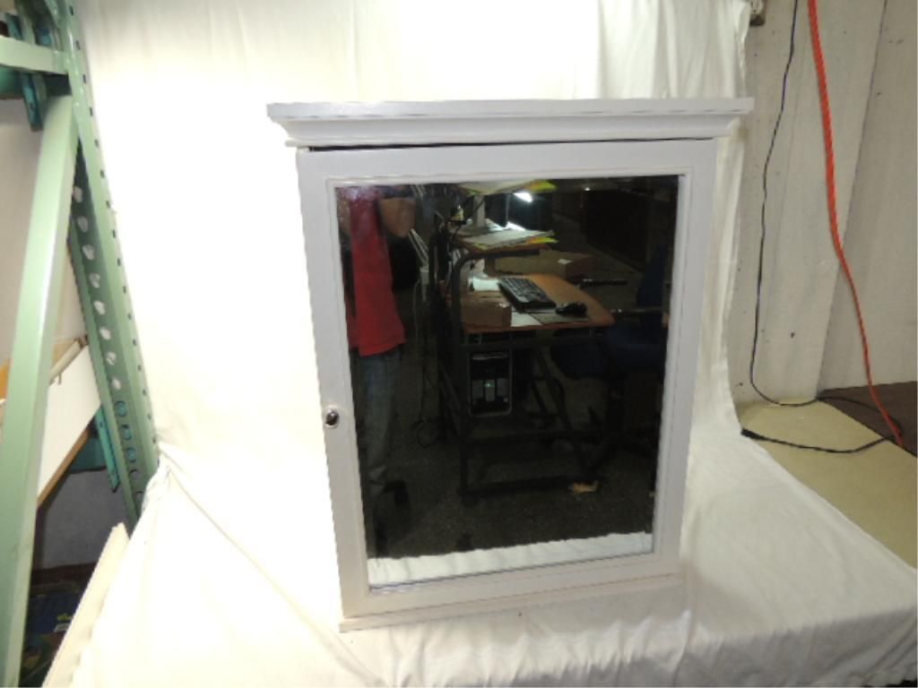 NICE DETAIL. BATHROOM MEDICINE CABINET MIRROR WITH STORAGE. WHITE WOOD MOLDING DETAIL. GROWN MOLDING TOP. SILVER KNOB. 20W X 28T X 4D. AS SHOWN SEE PHOTO FOR MORE DETAILS