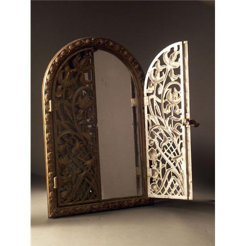 MIRROR WITH METALWORK: Oval shaped case metal window frame with ornate scroll and floral doors, possibly an Italian sacristy door, now containing a mirror, circa 1880, 25'' x 16''.