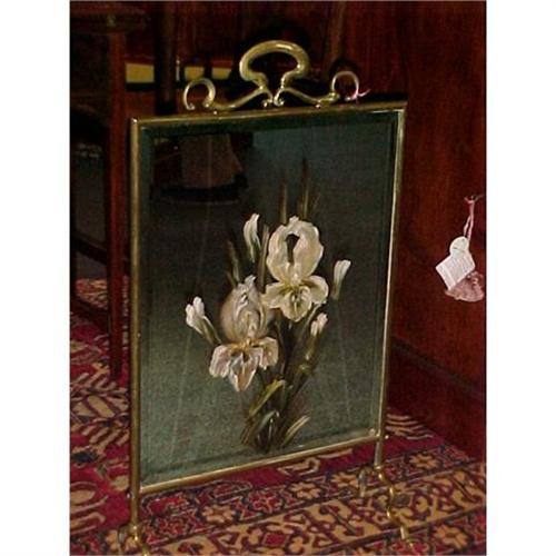 A beautiful English Brass framed Art Nouveau mirrored Firescreen with beautifully hand painted white Irises to the centre front. It is in very good condition, ca 1900.