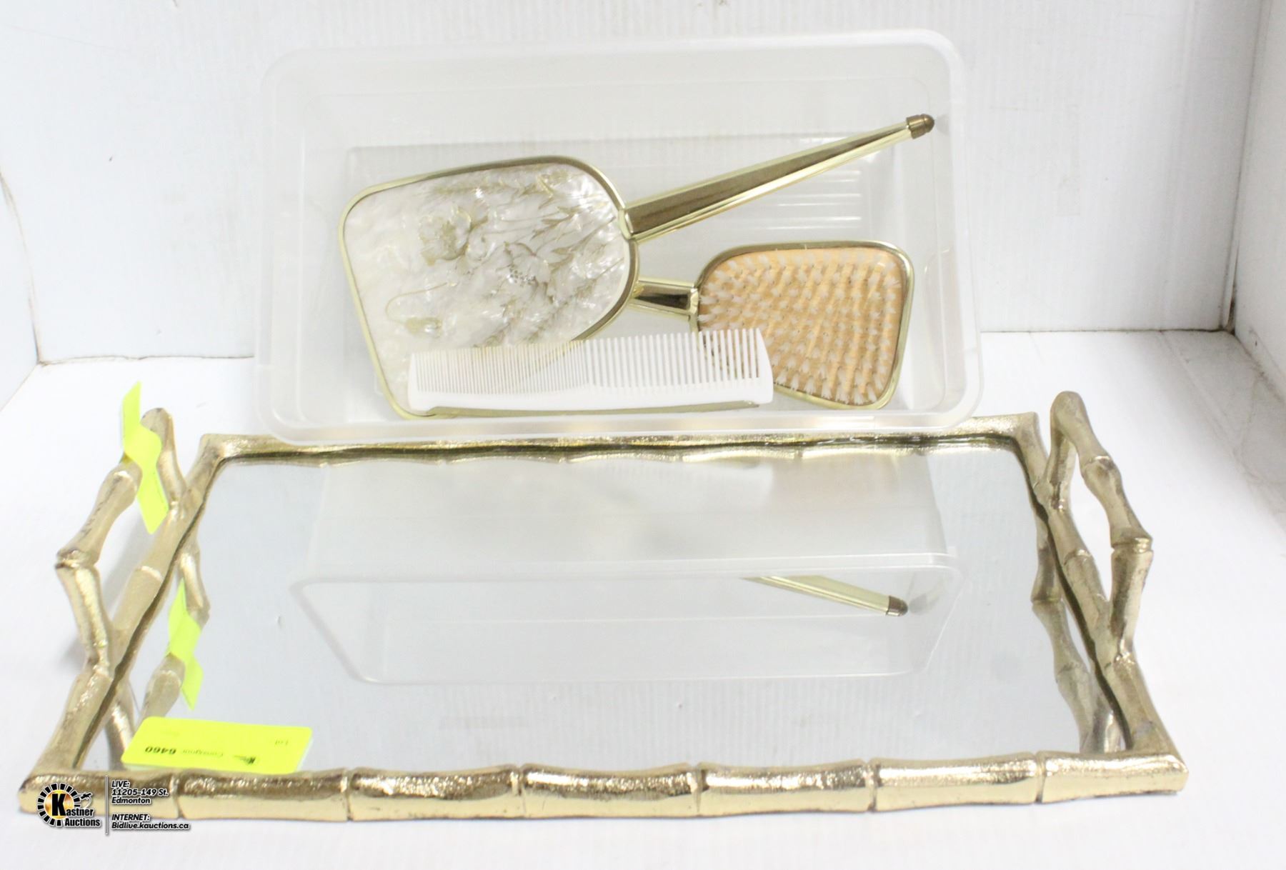 MIRRORED HANDLED TRAY + VANITY SET BRUSH, COMB,