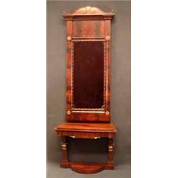 SPEGEL MED KONSOLBORD, MAHOGNY, SVÄNGD BOTTENPLATTA, SIDOPELAR MED BRONSERADE KAPILÄRER, UTSKJUTANDE HÖRN PÅ SKIVAN, SPEGEL MED SVÄNGT KRÖN, PÄRLSTAVSDEKOR, EMPIR TIDIGT 1800-TAL, H265, B95, D41