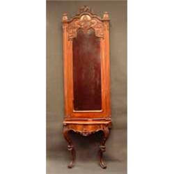 SPEGEL MED KONSOLBORD, MAHOGNY, SVÄNGDA SKURNA BEN, KÄLAD SKIVA, SPEGEL MED UPPSVÄNGT GENOMBRUTET KRÖN, DEKOR AV BLADORNAMENT, SENEMPIR C. 1860, H280, B86, D40