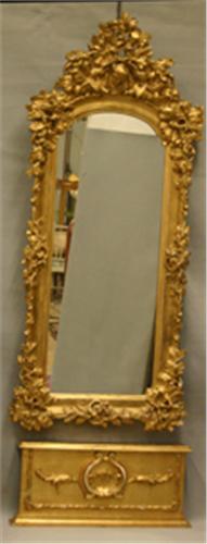SALONGSSPEGEL, FÖRGYLLD OCH BRONSERAD, SIDOR MED DEKOR AV EKLÖV, UPPSVÄNGT GENOMBRUTET KRÖN, DEKOR AV JÄGARE, FÅGLAR OCH HARE, NYROKOKO C. 1870, LITEN FÖRGYLLD KONSOL MEDFÖLJER, HÖJD MED KONSOL 260, B87