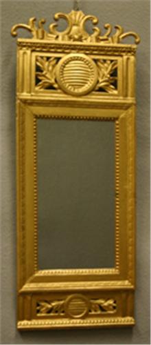 SPEGEL, BRONSERAD, SKUREN GENOMBRUTEN ORNAMENTIK, GUSTAVIANSK, 1700-TALETS SENARE DEL, H77, B32 (KRÖNET AVKORTAT OCH KOMPLETTERAT)