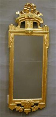 SPEGEL, FÖRGYLLD , REKTANGULÄR, GIRLANDFORMAD UNDERDEL, GENOMBRUTET ÖVERSTYCKE MED ROSETTKRÖN, GUSTAVIANSK, 1700-TAL, BAKSIDA MED LACKSIGILL BL A 3 KRONOR, 140X56 (BAKSTYCKE SAKNAS, SENARE GLAS, OMARBETAD)