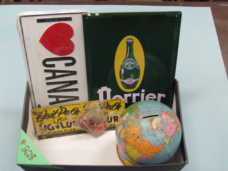 MISC BOX OF GOODIES (GLOBES SIGNS FISHING LURES)