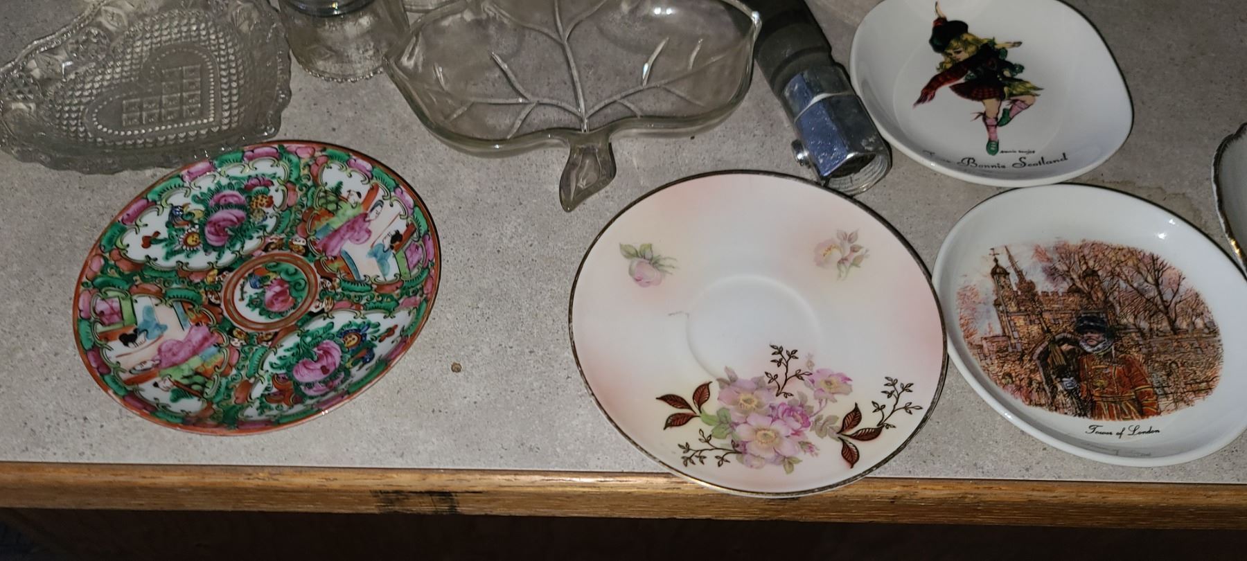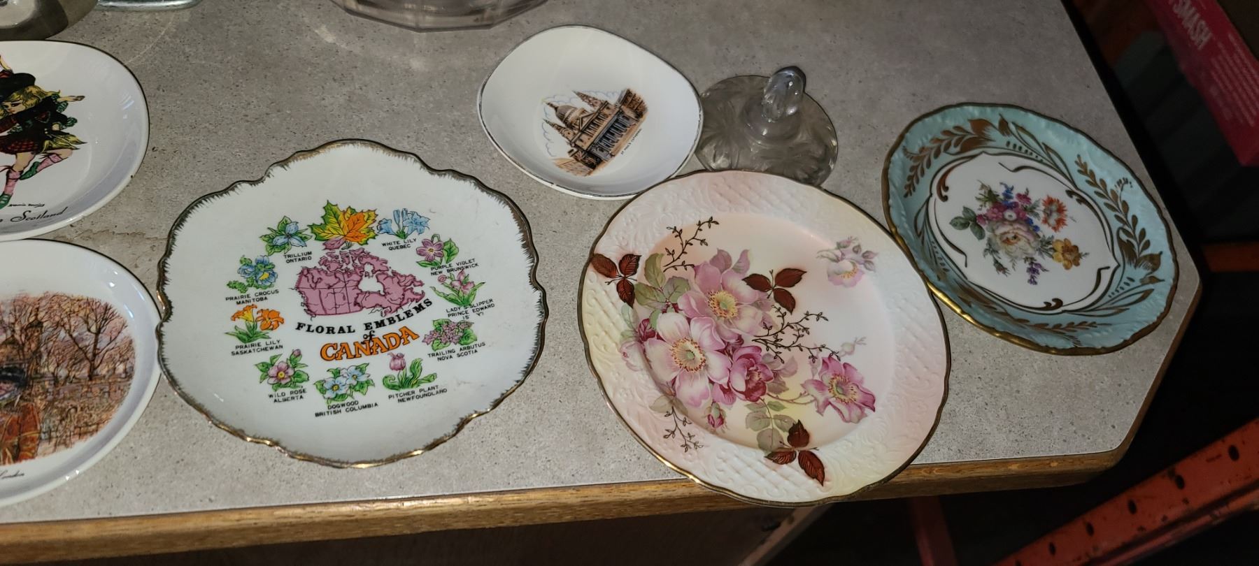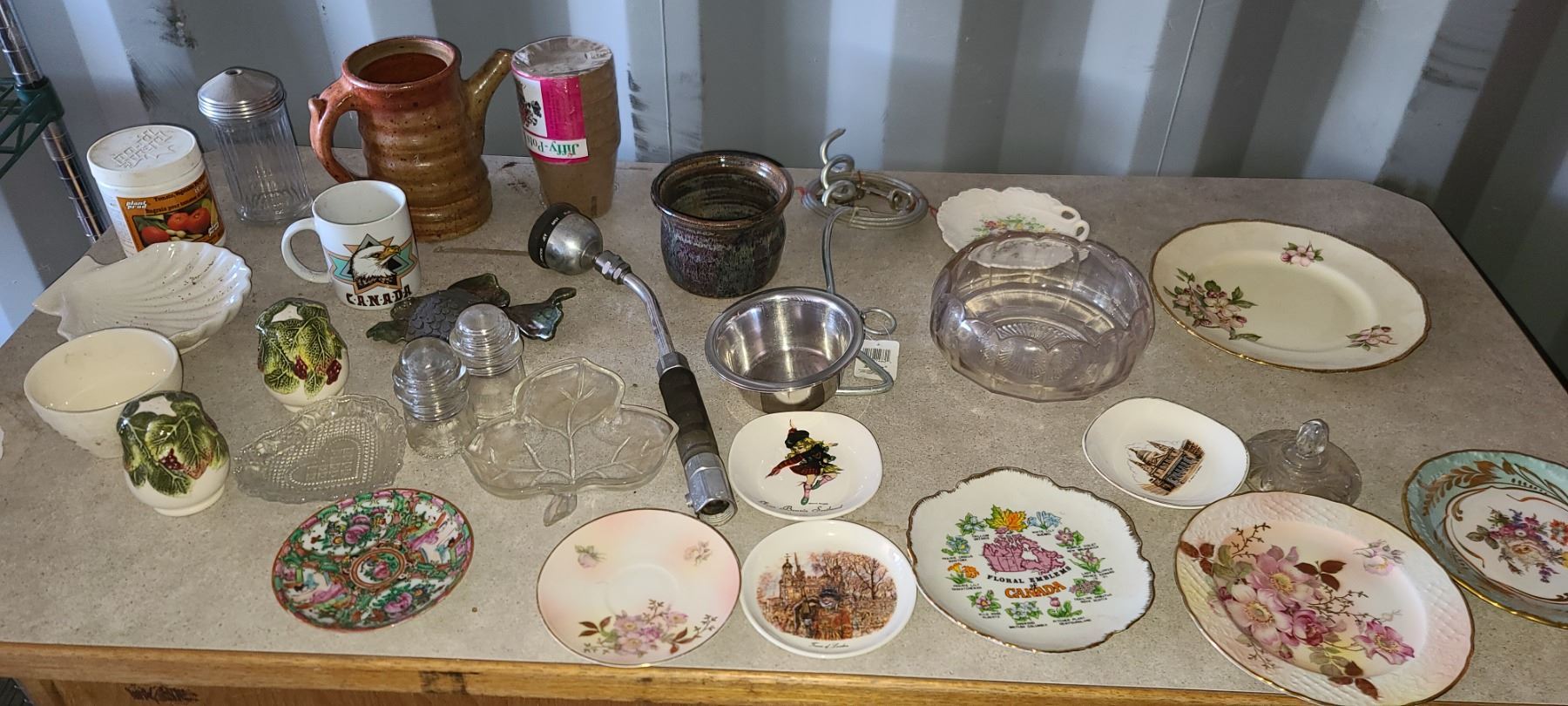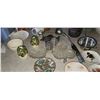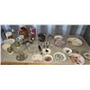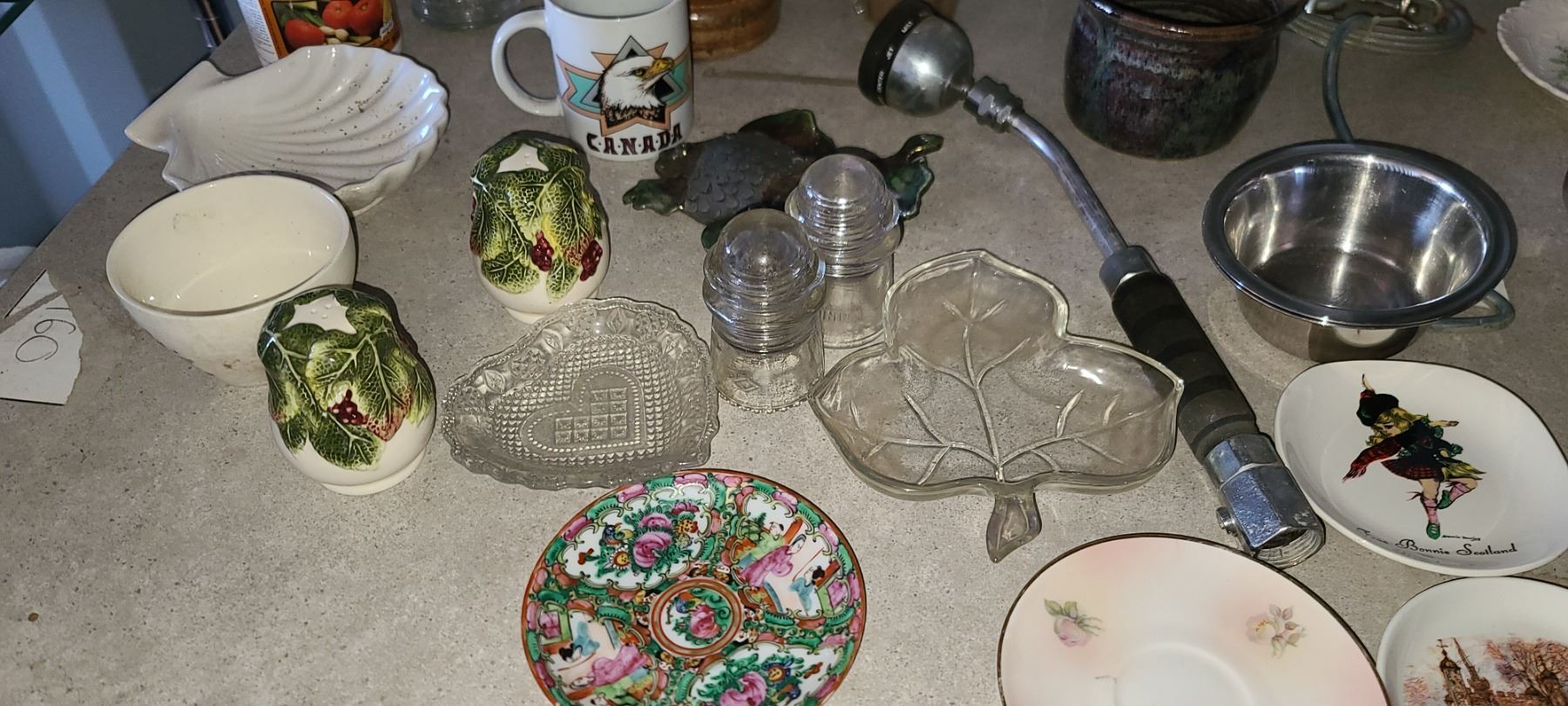 MISC CANDY DISHES, S&P SHAKERS, GLASS INSULATOR, PLATES, DISHES, DOG LEASHES