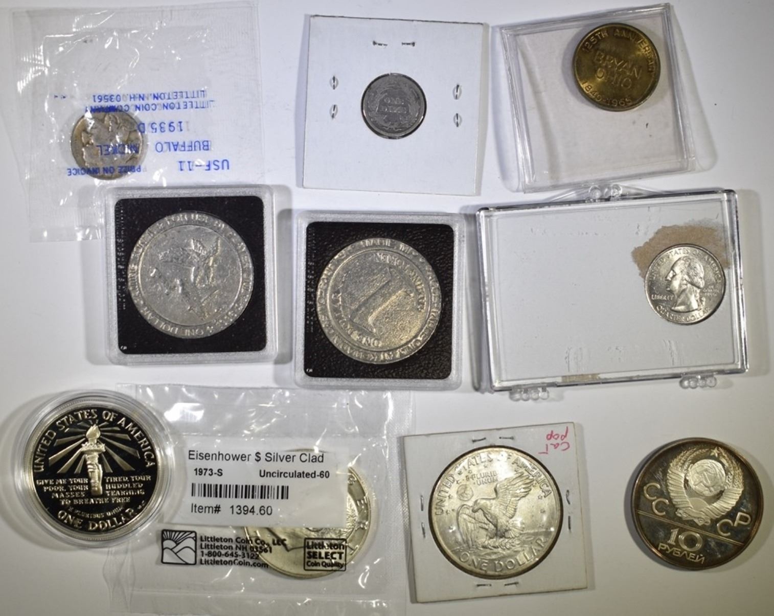 1935-D BUFFALO NICKEL, 1916 BARBER DIME, 1971-S & 1973-S SILVER IKE DOLLARS, 1986 PROOF STATUE OF LIBERTY SILVER DOLLAR, NEBRASKA STATE QUARTER, BRYAN OH 125th ANNIV TOKEN, 2-MICHIGAN TOKENS & SILVER RUSSIAN