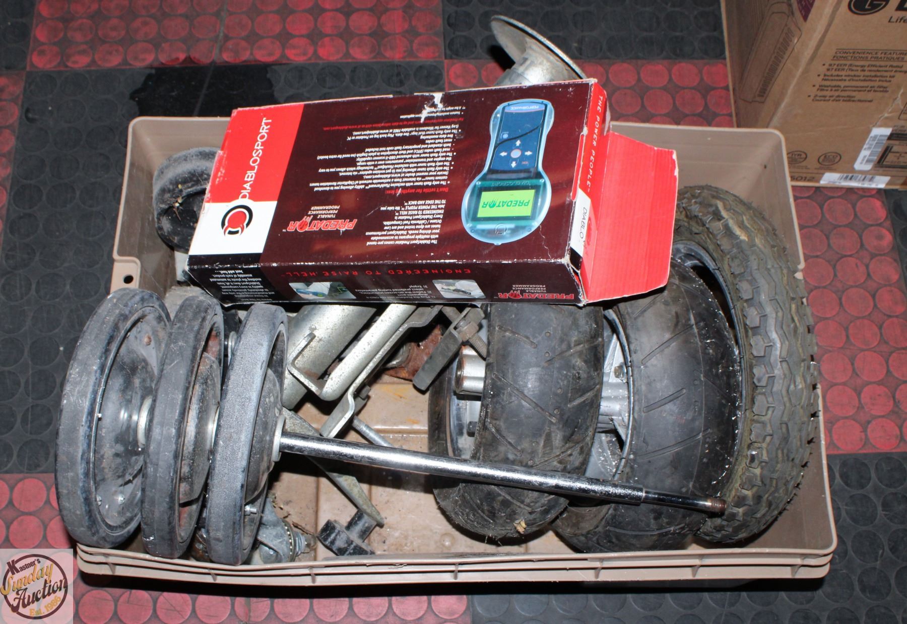 MISC CRATE INCLUDES TUNER, SCOOTER WHEELS, 3 SETS-
