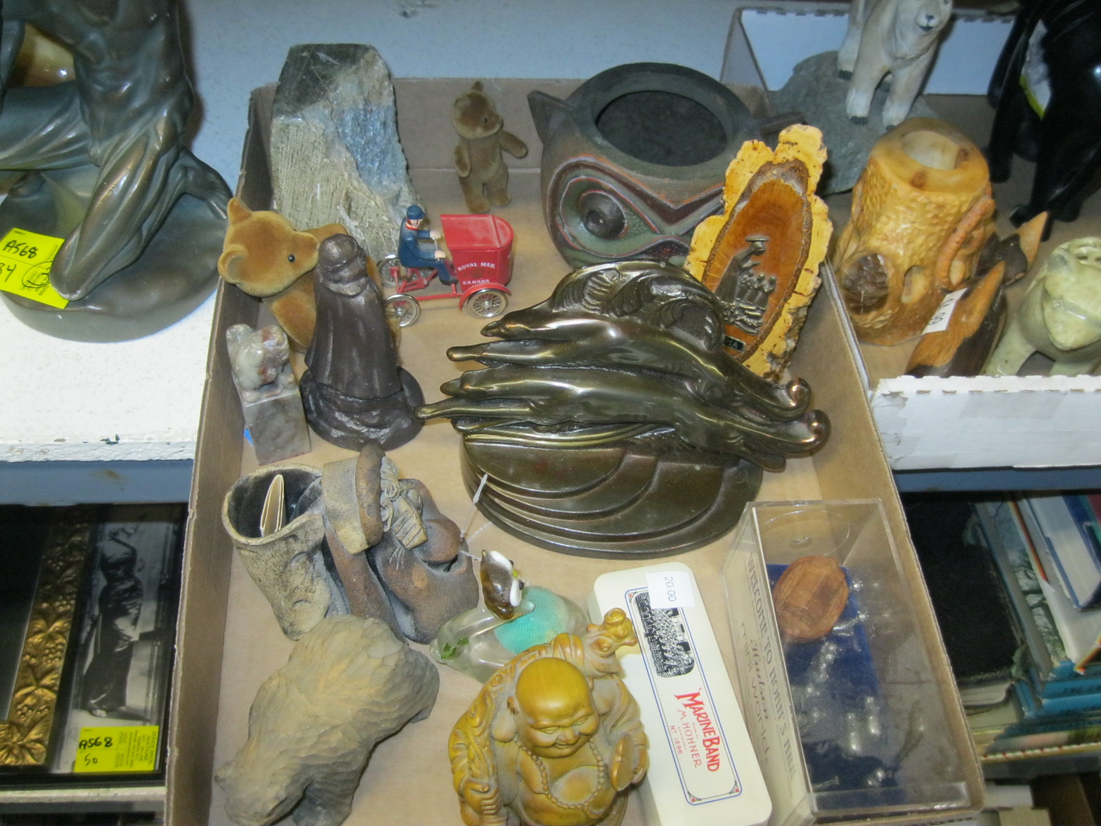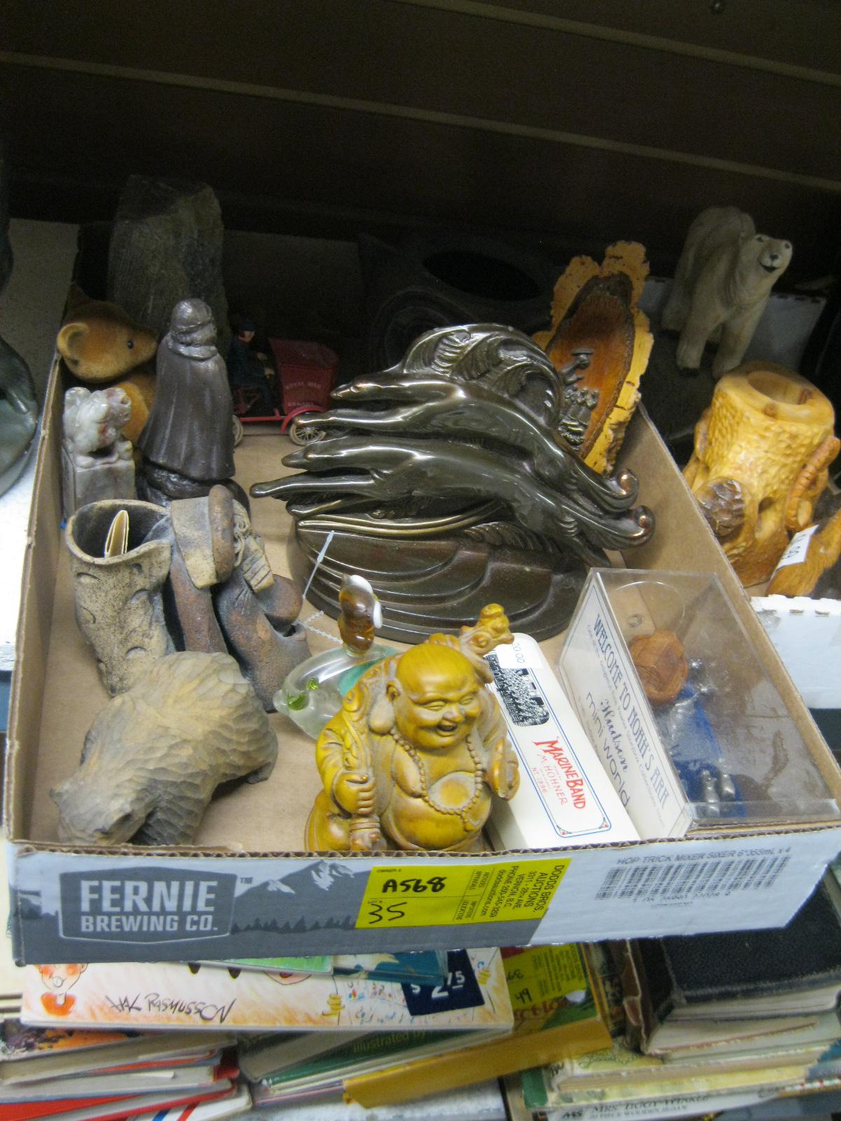 MISC. FIGURINES, POTTERY, HARMONICA, ETC.