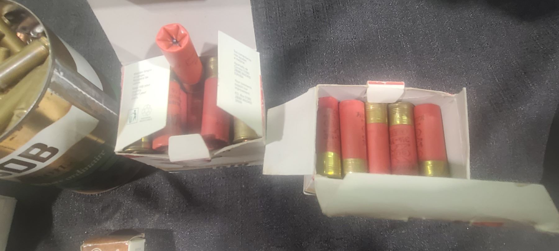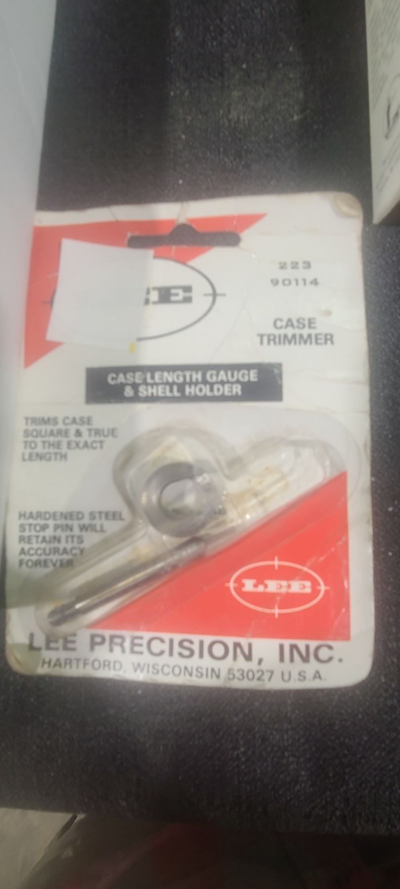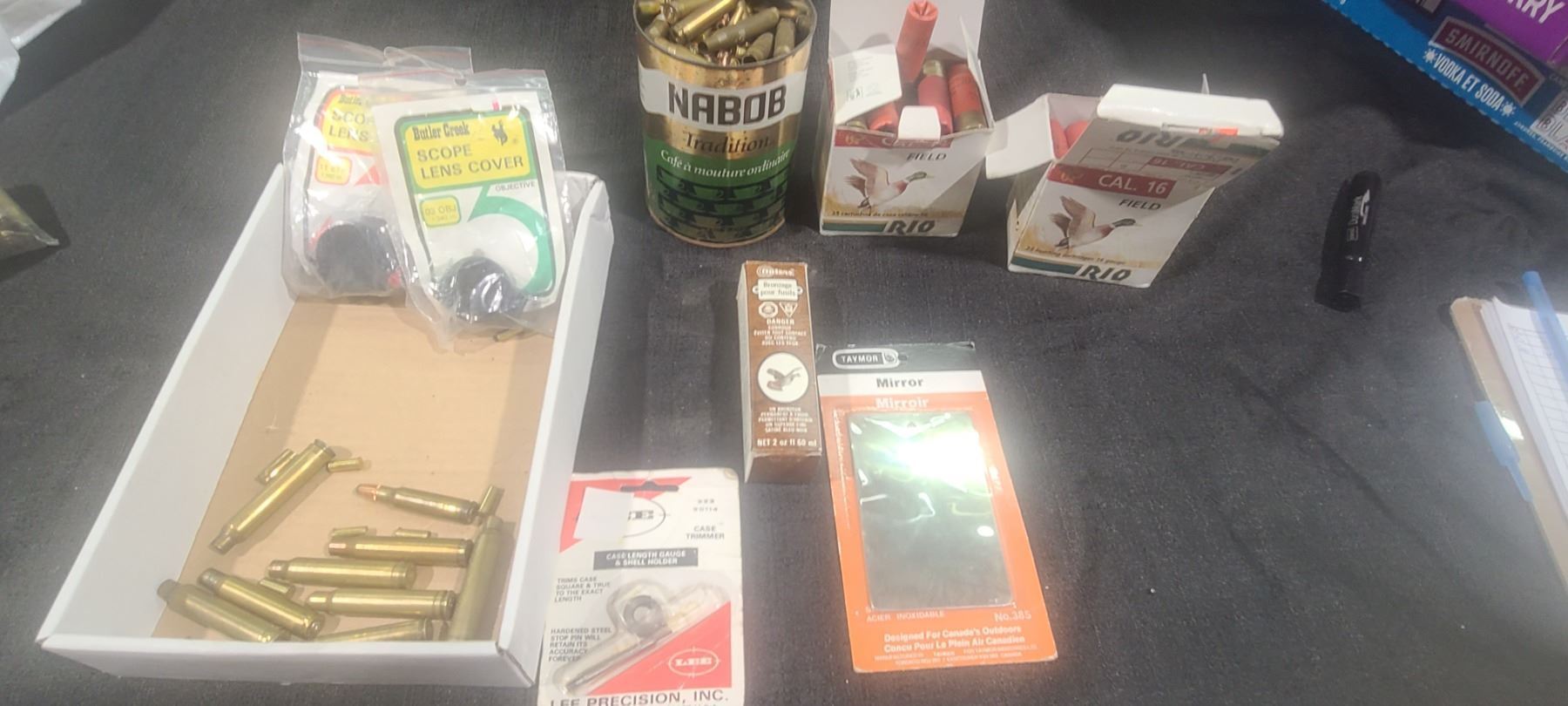 MISC FLAT: TWO BOXES OF HAND LOADED 16GA #6 (USE AT OWN RISK), LEE .223 CASE TRIMMER, EMERGENCY MIRROR, CAN OF MISC CASES, DEAD PRIMERS, BUTER CREEK SCOPE CAPS/COVERS