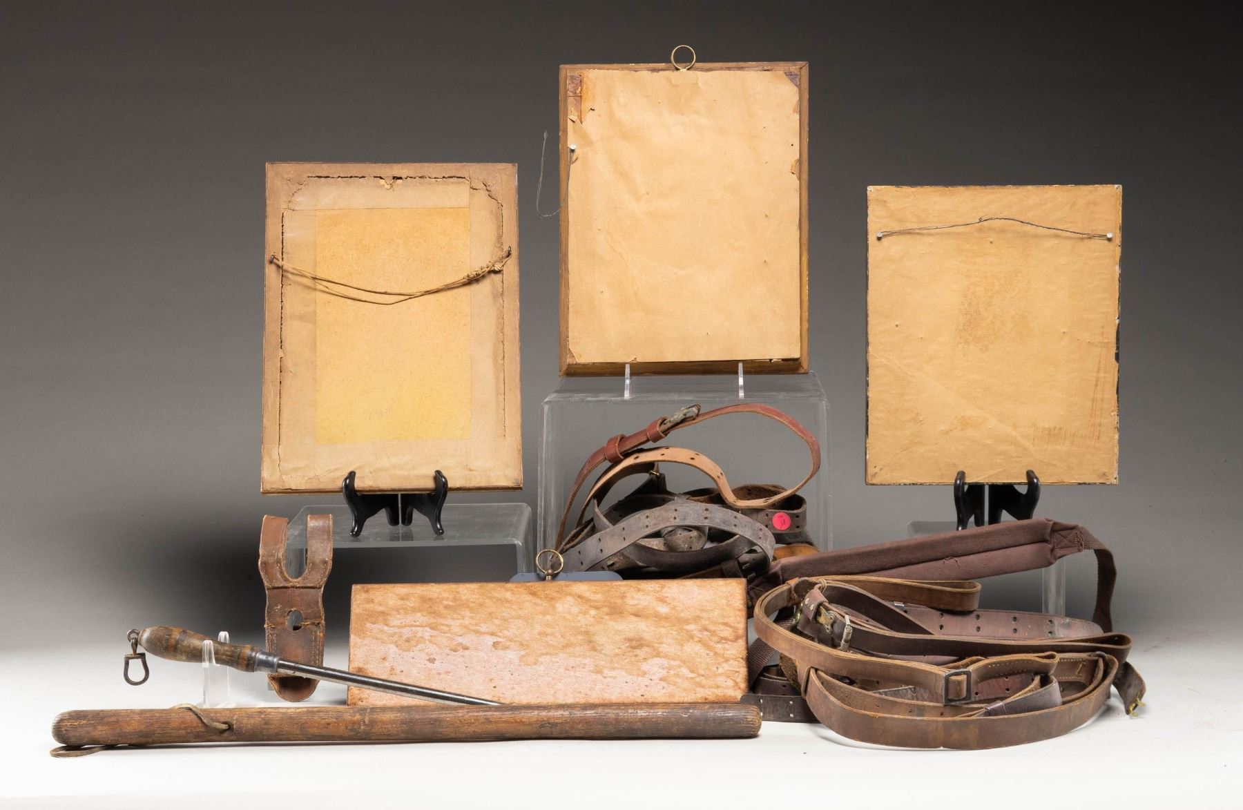 ASSORTED PRINTS & LEATHER. This lot includes a pair of Napoleanic Era British Artillery shoulder scales on a display board. Also included are 3 frame prints. 1 Frame freatures a female. Another frame features engraving of Captain Charles Saxton, a British Naval captain. Another frame contains a French advertisement for Jospeh Robert breechloading shotguns. Lot also includes Arisaka bayonet frog. / 26" wooden baton. / sharpening stick. / 9 Misc. leather slings appearing US military style. CONDITION: shoulder scales in good mustard patina appearance with light marks. Frame shows scattered marks & scratches, but pictures appear intact (unable to remove prints for authenticity). Leather appears in fair intact condition showing cracking. (02-24526-15/MD). NON-GUN. $200-300.