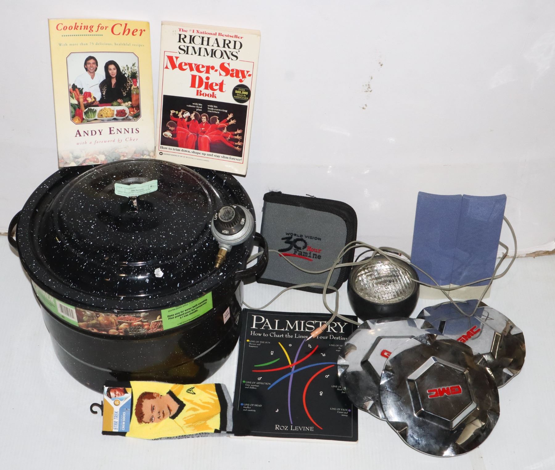 TREK SOCKS, 3 GMC CAPS, PROPANE ADJUSTER COOKBOOKS PALMISTRY BOOK ETC