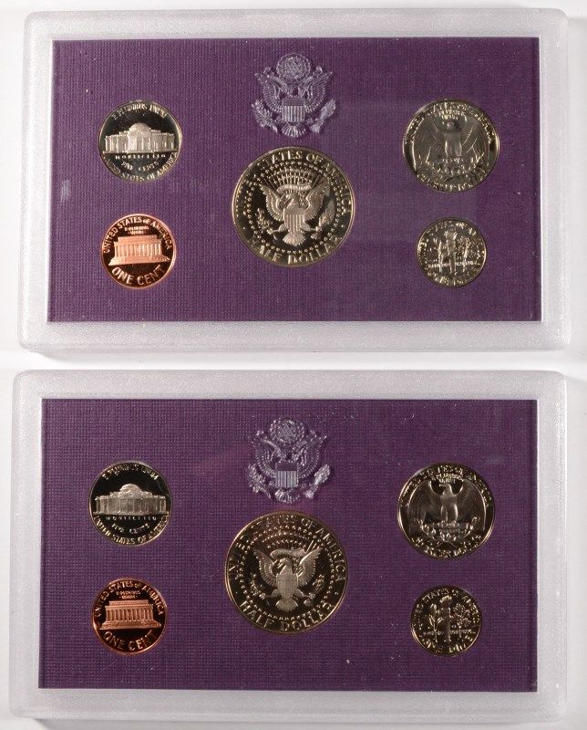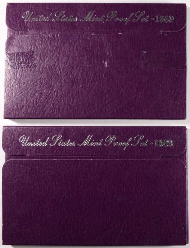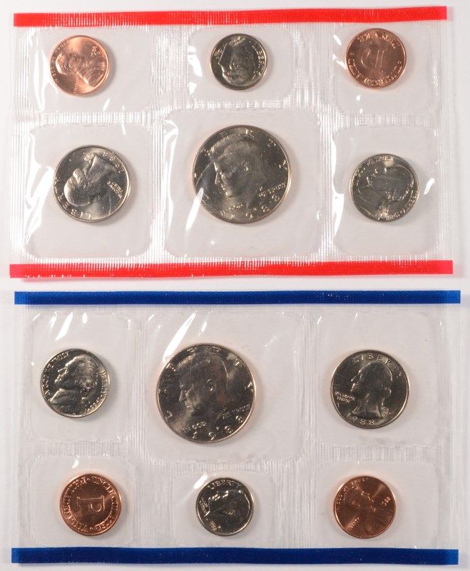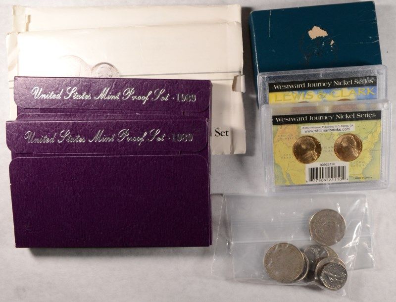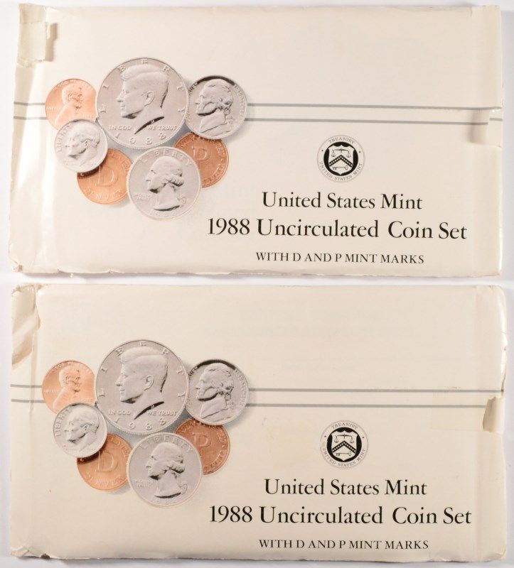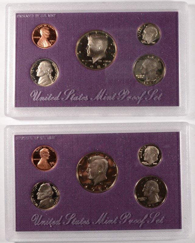 2-1989 U.S. PROOF SETS, 2 1988 U,S, UNCIRCULATED SETS, AND A SMALL BAG OF FOREIGN COINS, ESTIMATE, $55.00 TO $65.00