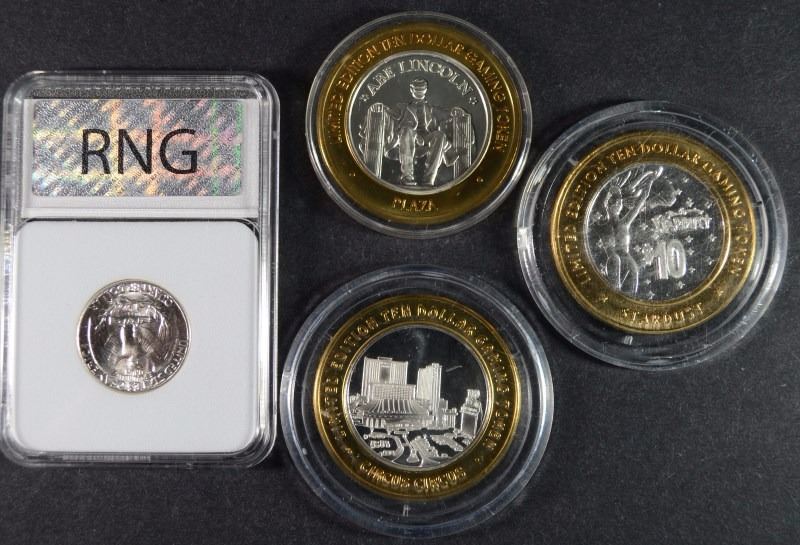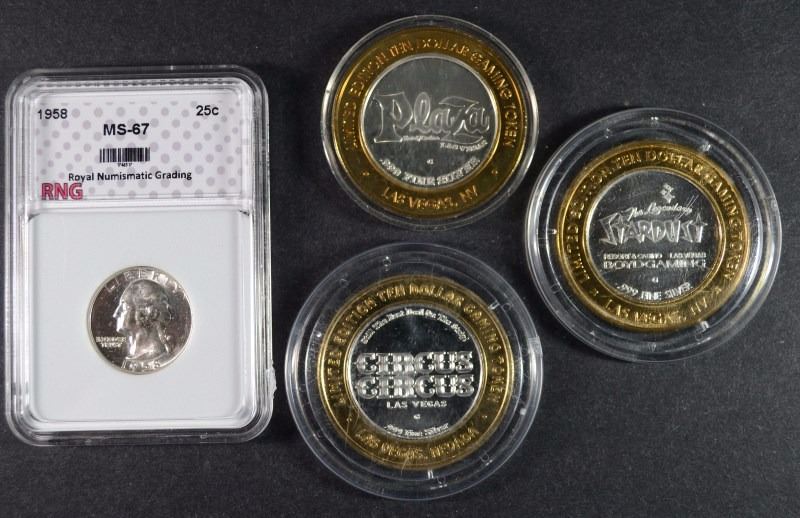 MISC LOT: (3) CASINO TOKENS & 1958 WASHINGTON QUARTER, RNG SUPERB GEM BU