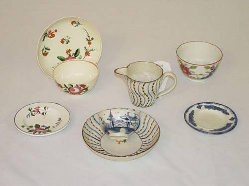 MISC. LOT (6) PCS. OF ENGLISH SOFT PASTE: (3) HANDLESS CUPS, (2) CUP PLATES, & (1) DECORATED CREAMER - CRAZING & DAMAGE;