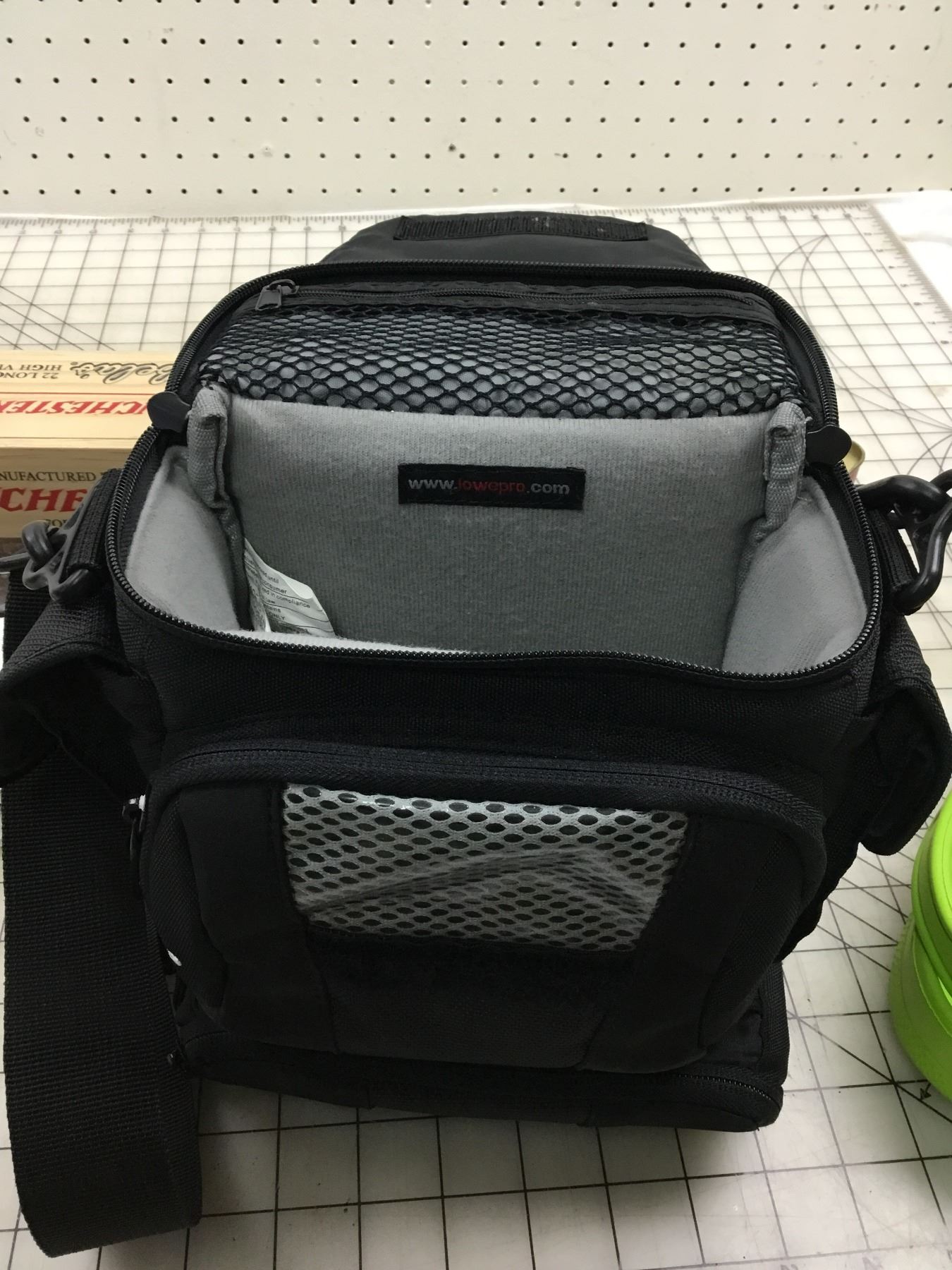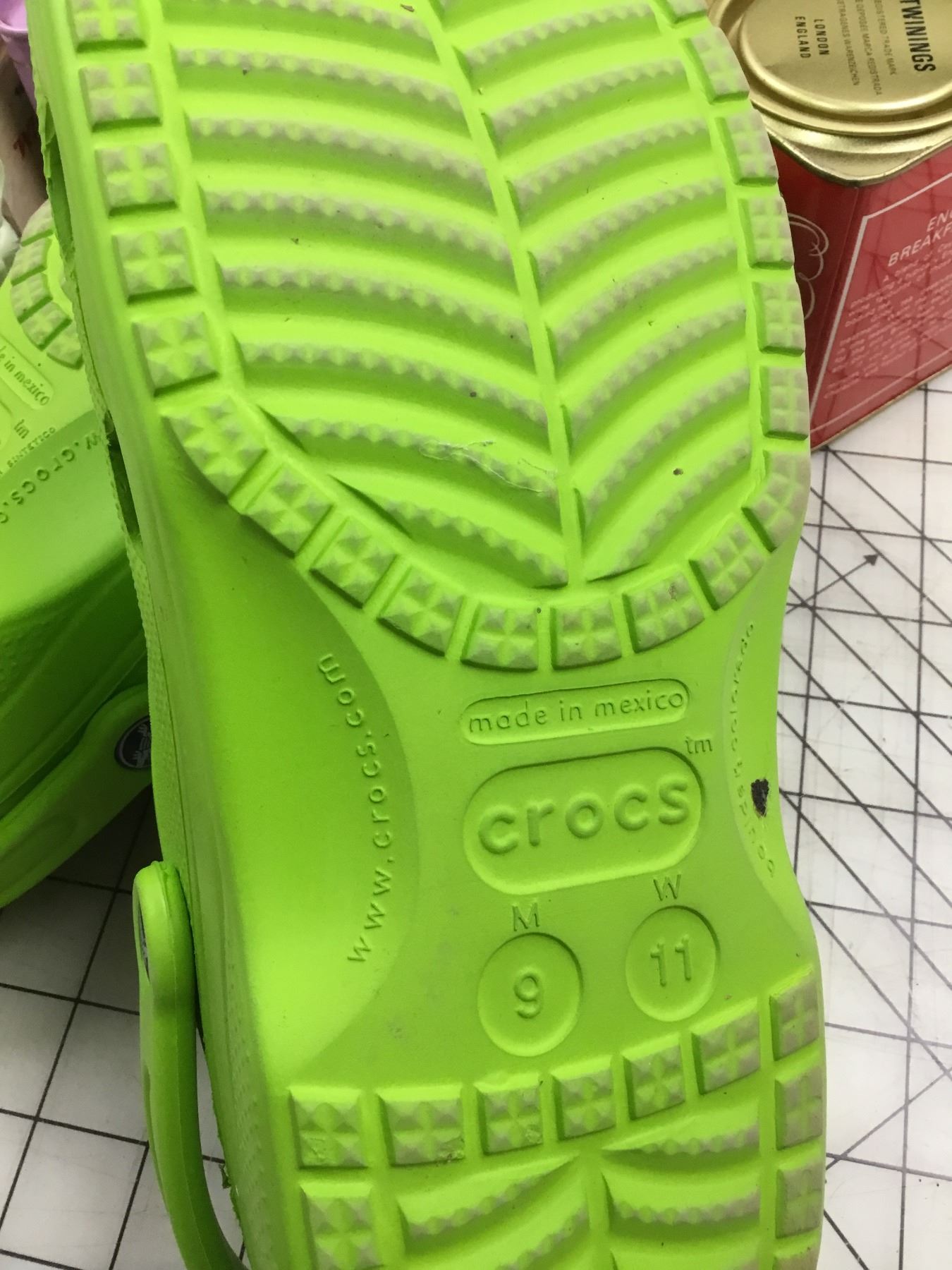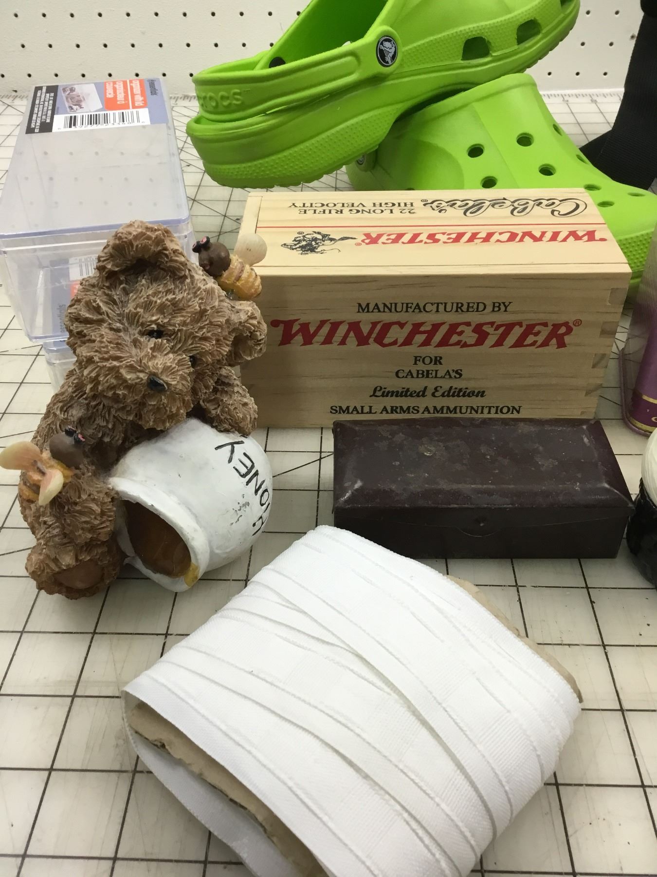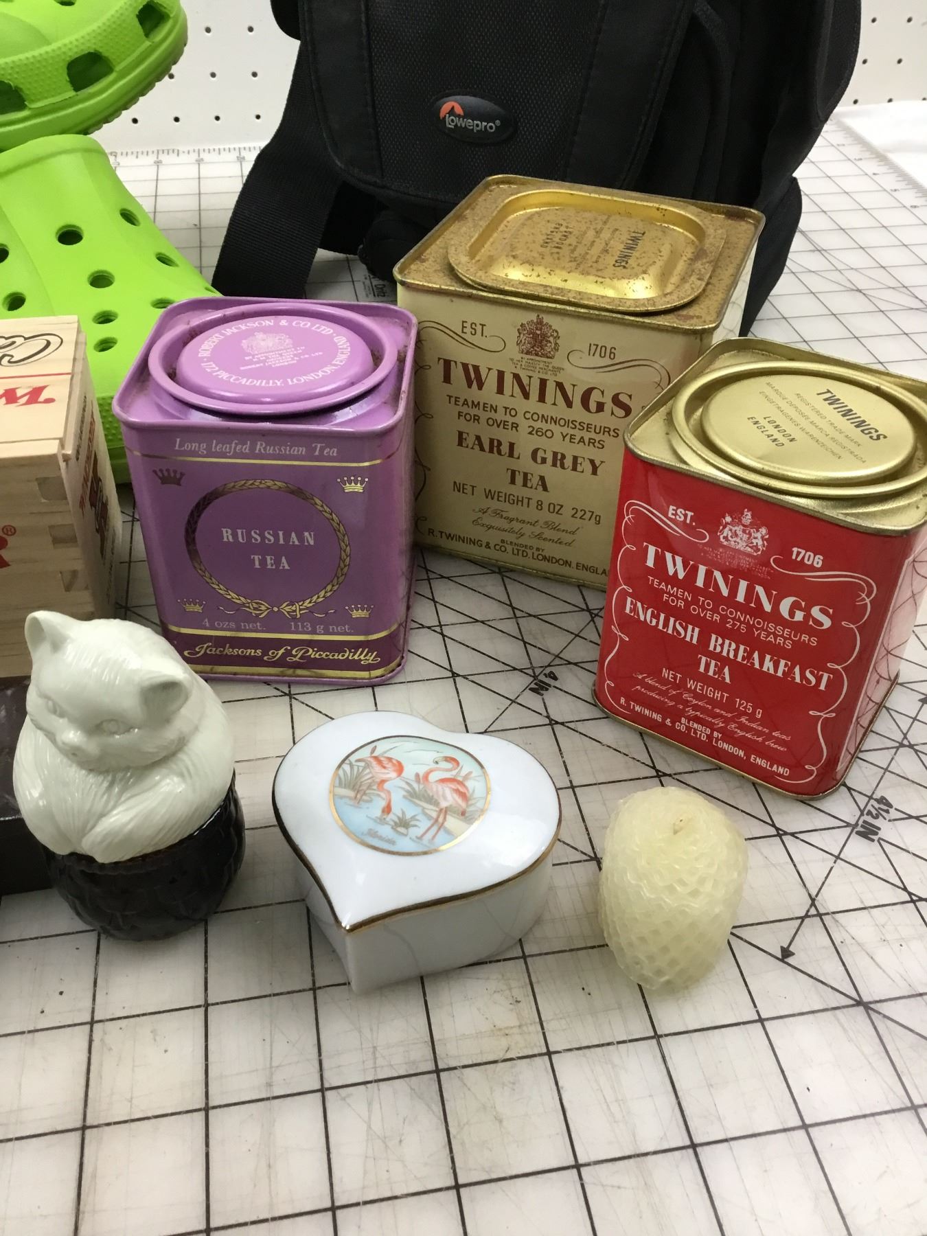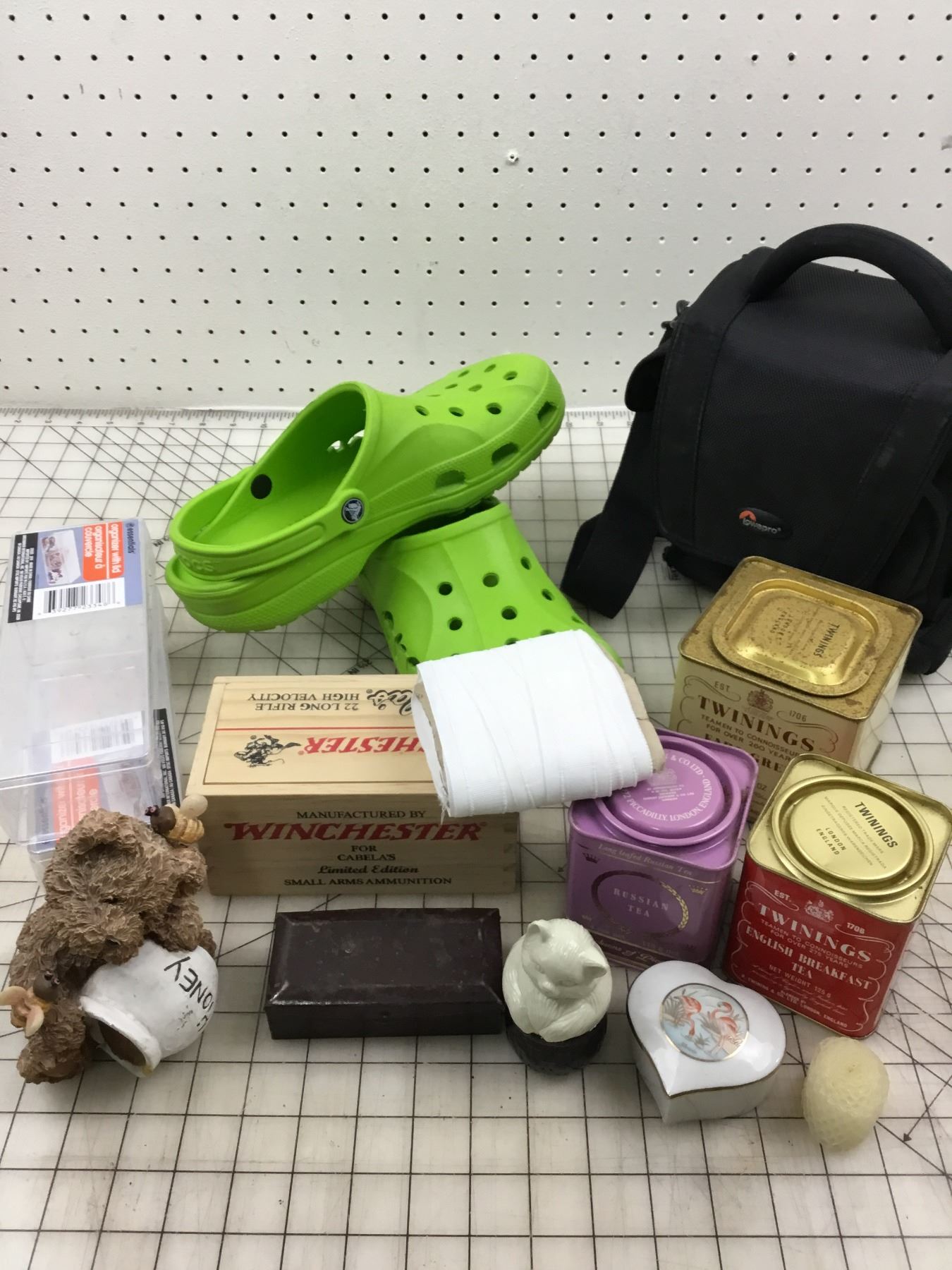 MISC LOT CONTAINERS, TINS, CAMERA BAG, CROCS ETC