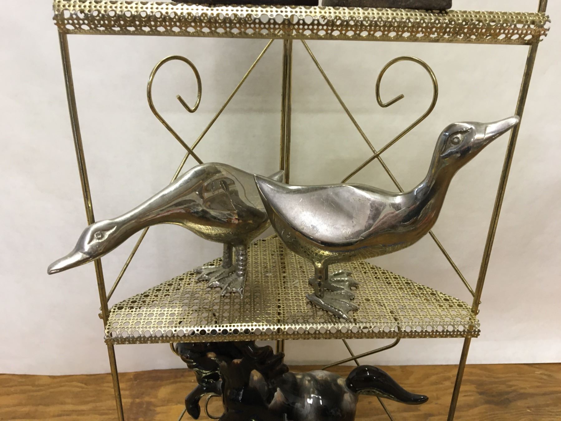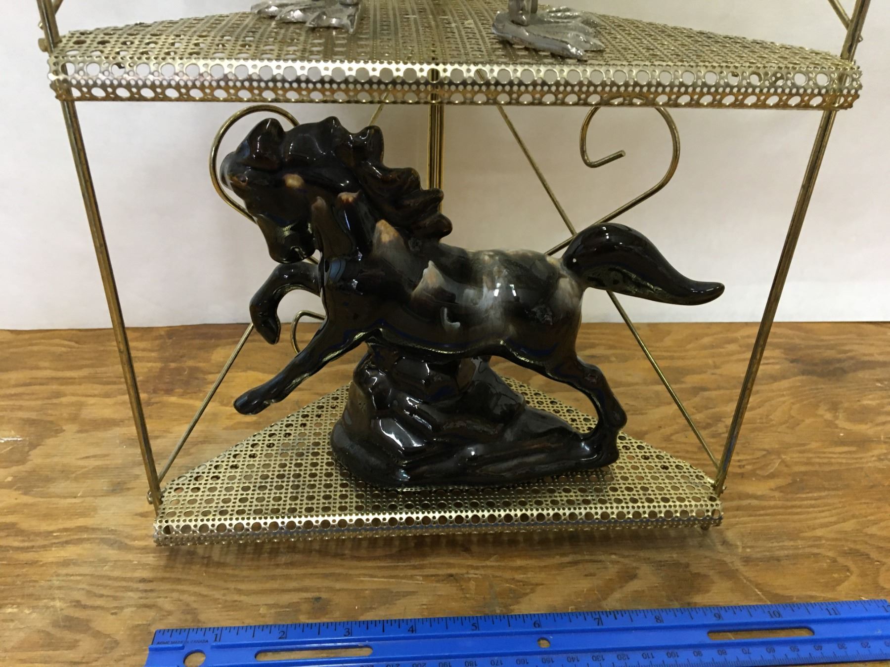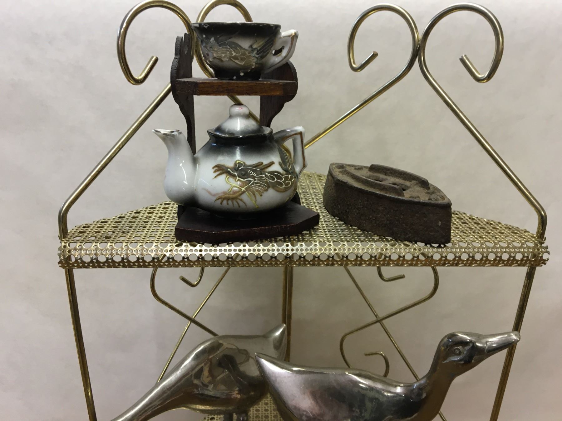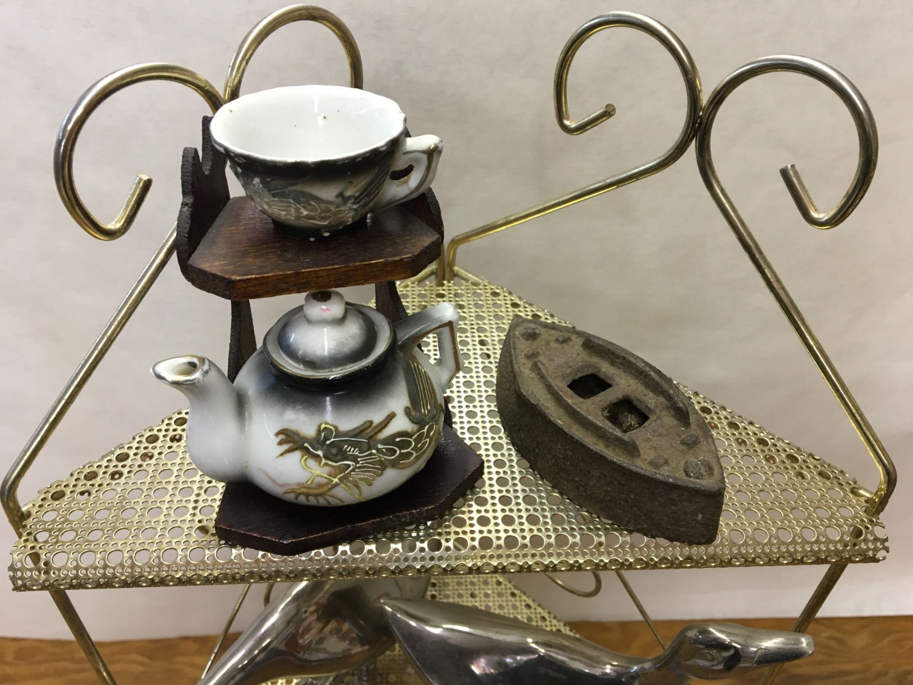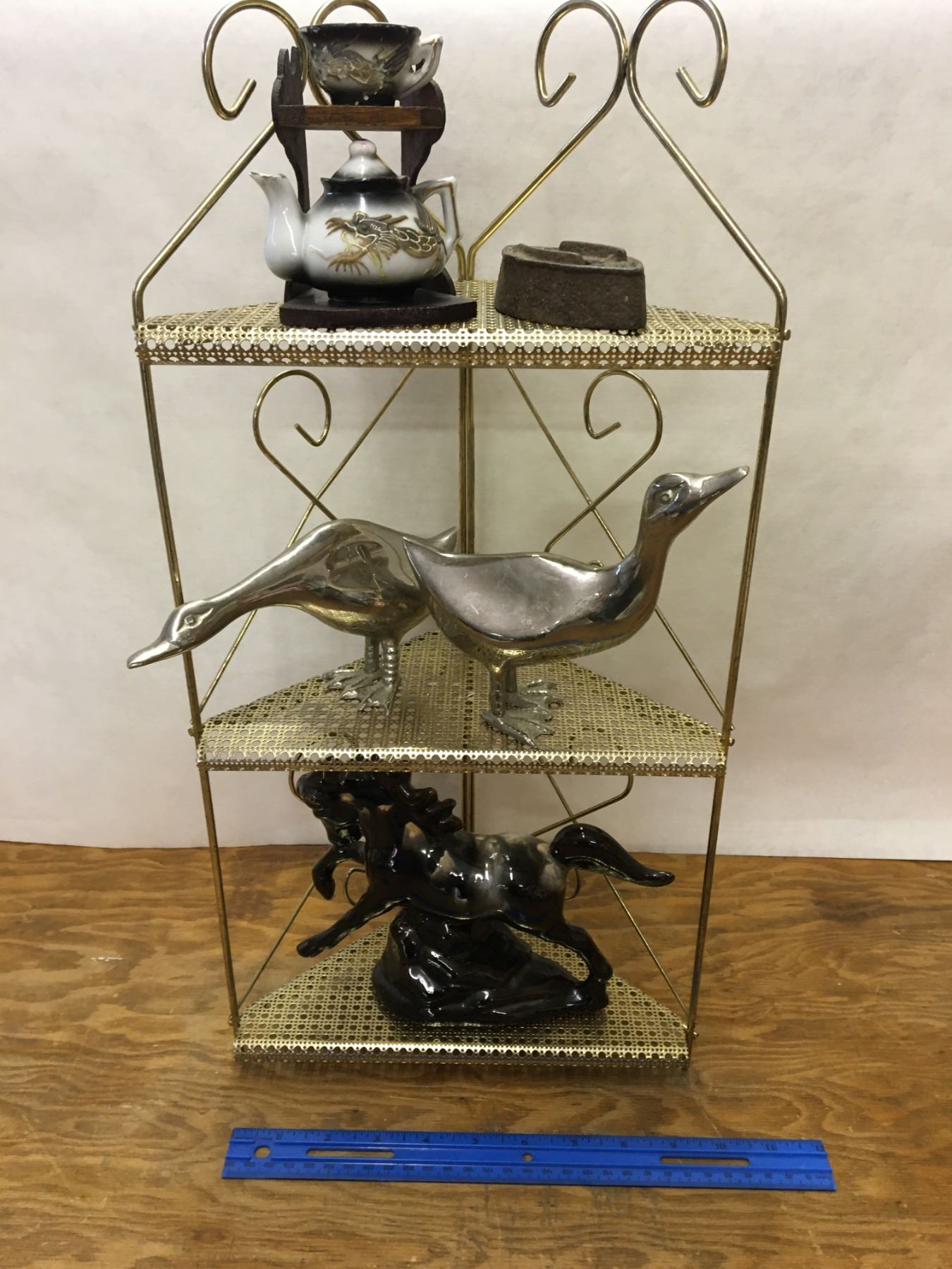 MISC LOT METAL SHELF AND COLLECTIBLES